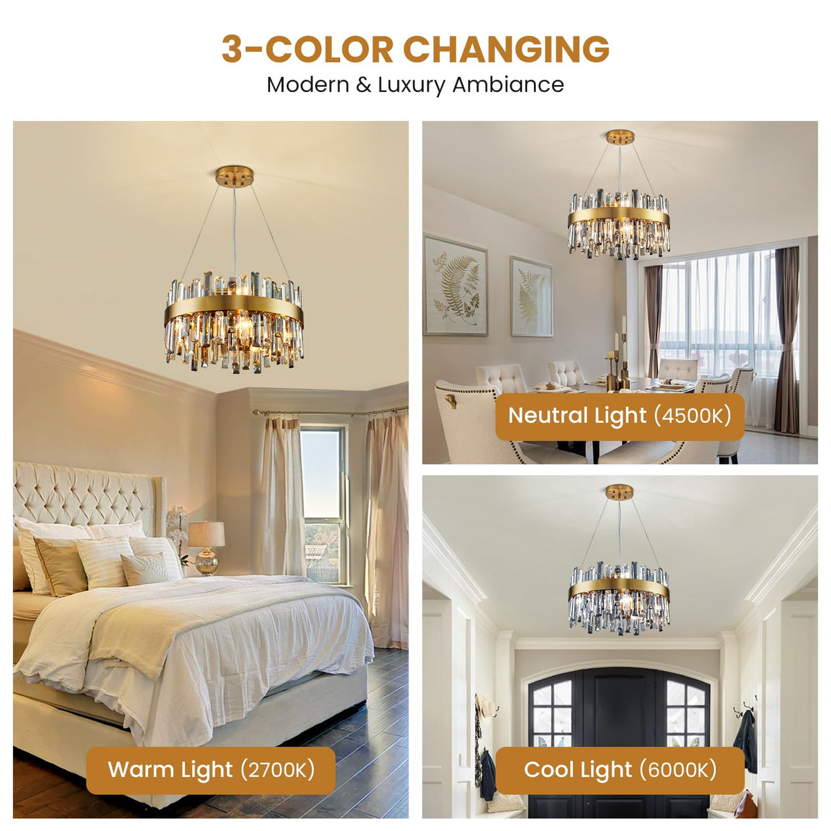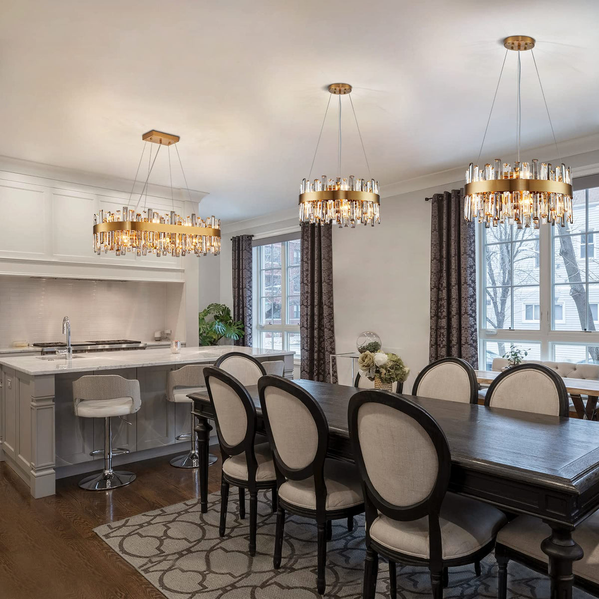 ???Major Updates?: New design 12-Lights modern chandelier (Old version: 8 Lights). Upgraded brushed gold lamp frame, easier for crystal installation, no more flimsy, looks more sturdy. Upgraded packing, strong enough to withstand rough handling and bumping, ensuring the chandelier you receive is in 100% good condition.