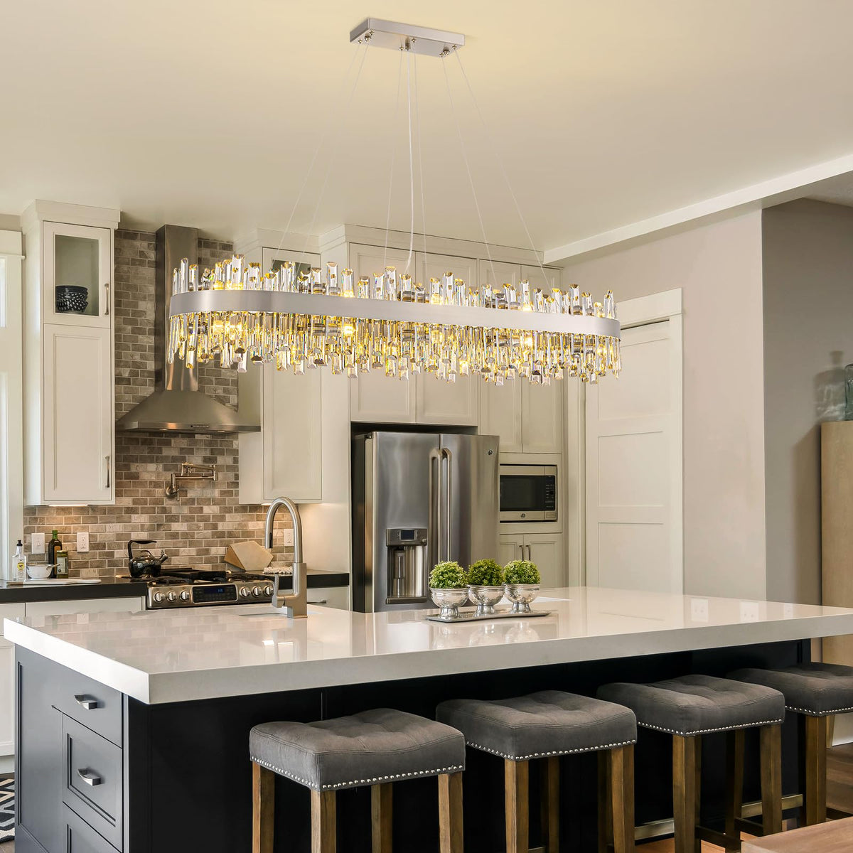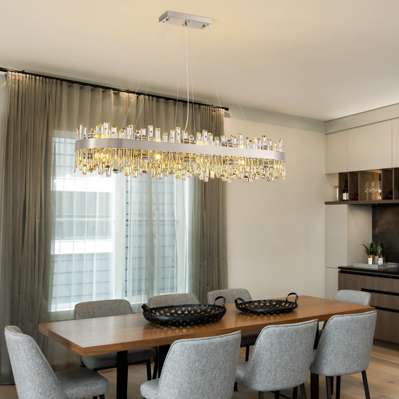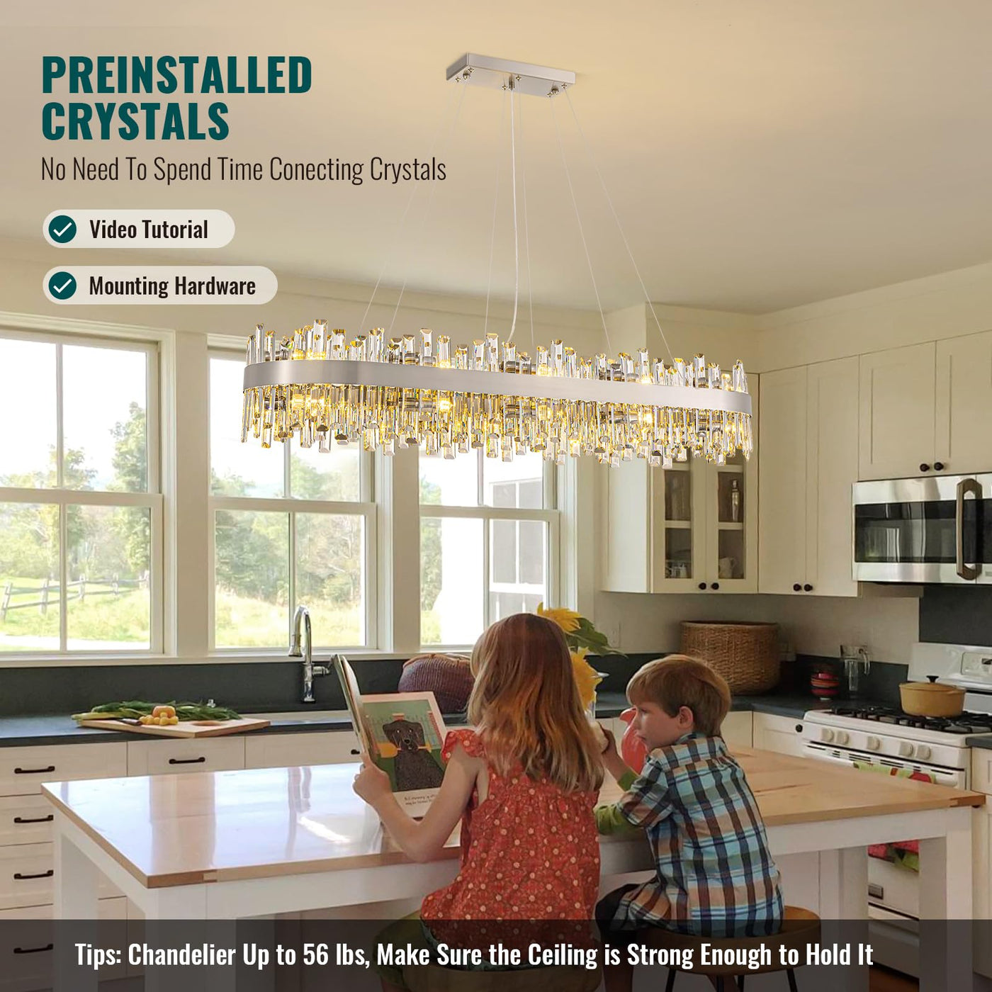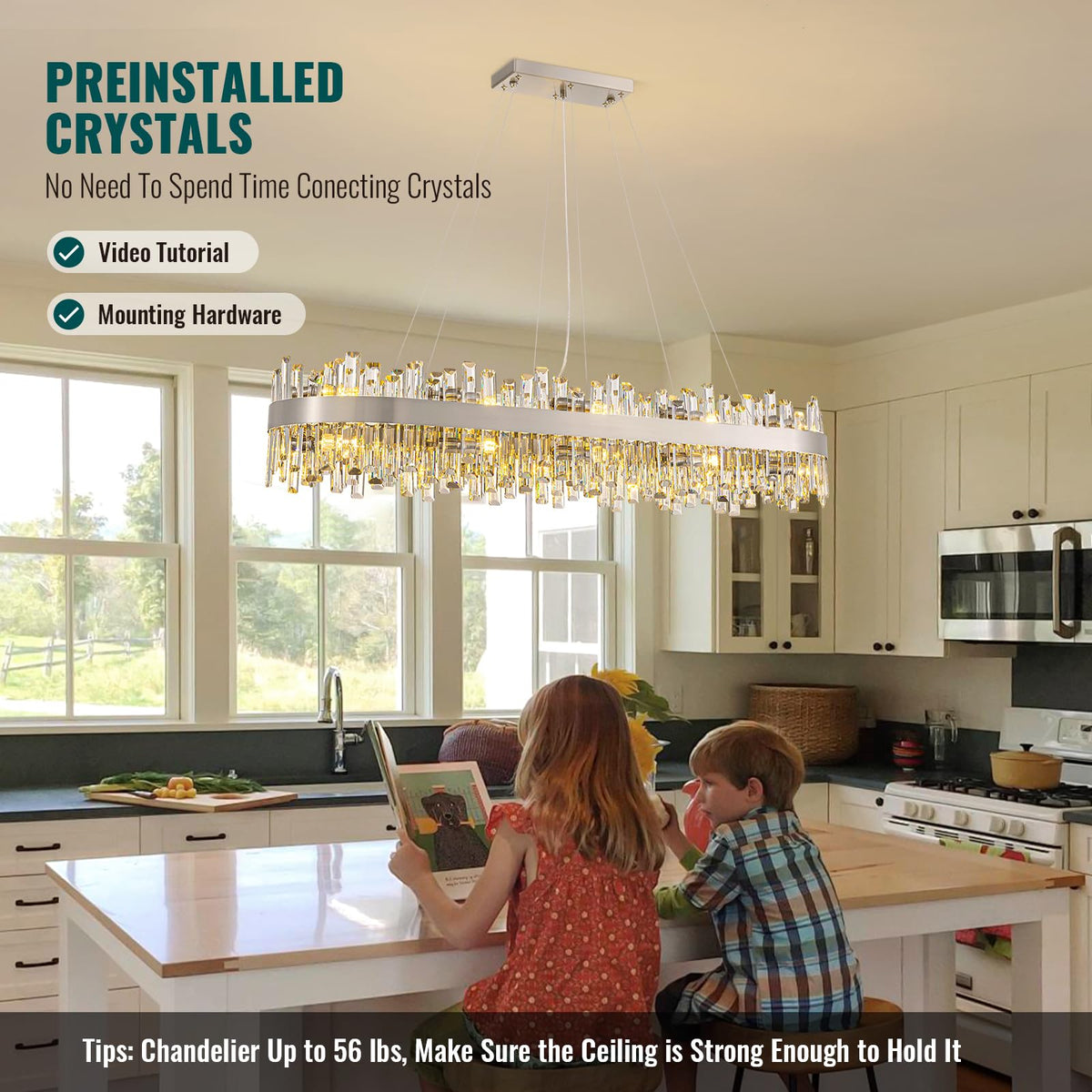 Product Description &Nbsp; This Luxury Brushed Nickel Oval Raindrop Crystal Chandelier Light Fixture Could Perfectly Illuminate Your House, Bringing A Modern And Contemporary Atmosphere And Creating A Stylish &Amp; Warm Ambience In Your House. It Also Adds Charm And Aesthetic To Your Living Area And It Can Be Perfectly Matched With Decoration Styles! &Nbsp; Specifications: &Nbsp; Type: Crystal Chandelier Style: Modern, Contemporary Fixture Finish: Brushed Nickel Material: Metal, K9 Crystal Light Source: 20 X E12 (Max 40W, Not Included) Dimension: L52''(130Cm) X W15.7''(40Cm) X H9.8''(25Cm) Switch Type: Push Button Mount Type: Ceiling Mount Sloped Ceiling Available: Yes Voltage: Ac 110V Weight: 44.1 Lb Application: Living Room,Dining Room, Kitchen Island, Bathroom, Entryway, Hallway, Bedroom,&Nbsp;Office,&Nbsp;Etc. &Nbsp; Packing&Nbsp;List * Lamp Body X 1 * Crystal Strands * A Pair Of Gloves * Mounting Hardware X 1 * An Installation Manual Note: 1. Full Assembly Required With Time And Effort, But It Will Be Definitely Worth It When You Have Done It. Please Check Carefully The Instruction Manual Before Installation And Follow Close To It. 2. Please Allow 1-2Cm Differs Due To Manual Measurement. 3. Due To Lighting Effects, Monitor'S Brightness/Contrast Settings Etc,There Could Be Some Slight Differences In The Color Tone Of The Pictures And The Actual Item. ? Due To The Unavoidable Wear And Tear During Transit, Free Replacement If Found Any Damage, We Promise To Give You A 100% Sincere After Service.