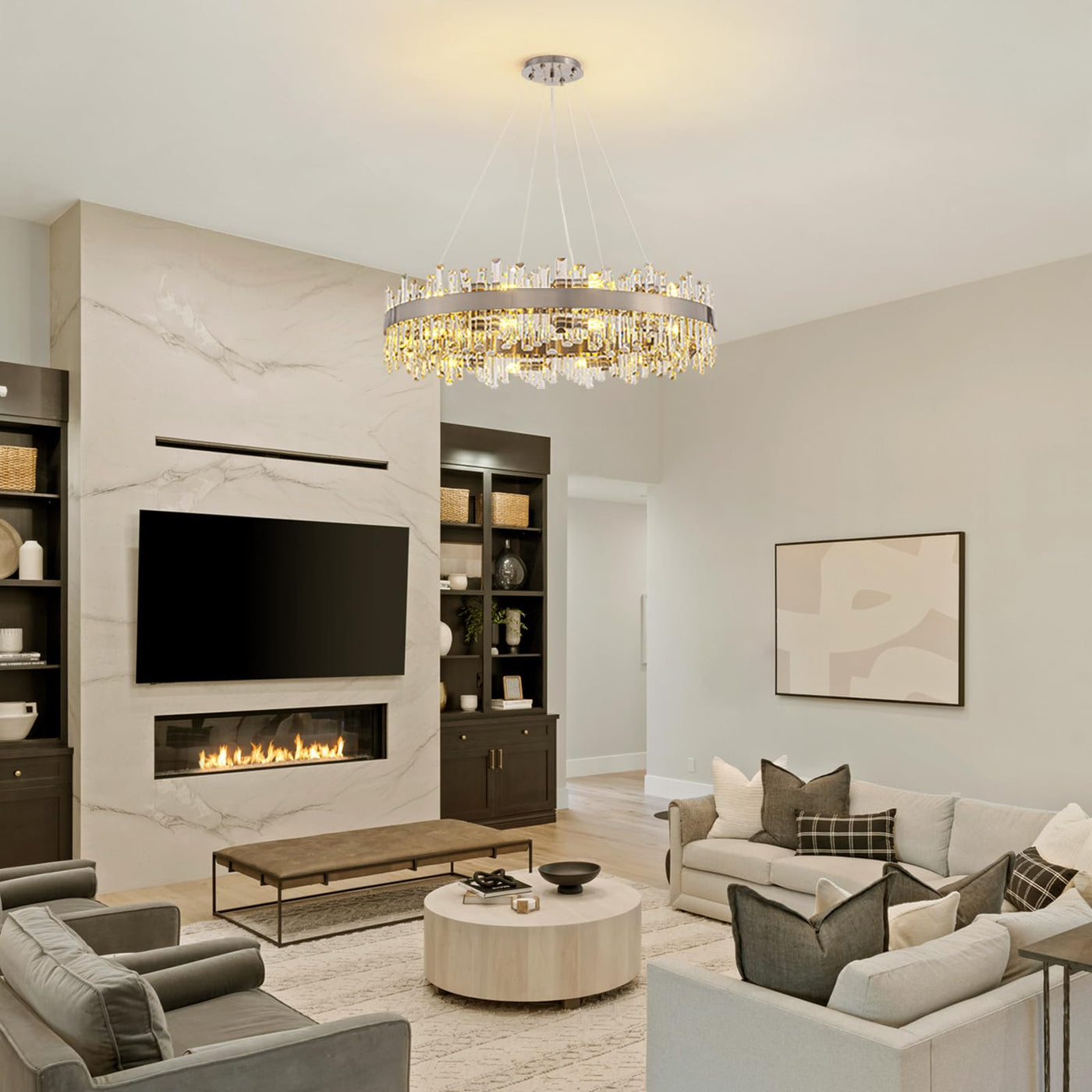 Siljoy 39.4'' Modern Crystal Chandelier, Luxury Large Nickel 2-Tiers Raindrop Chandelier, Adjustable Flush Mount Pendant Ceiling