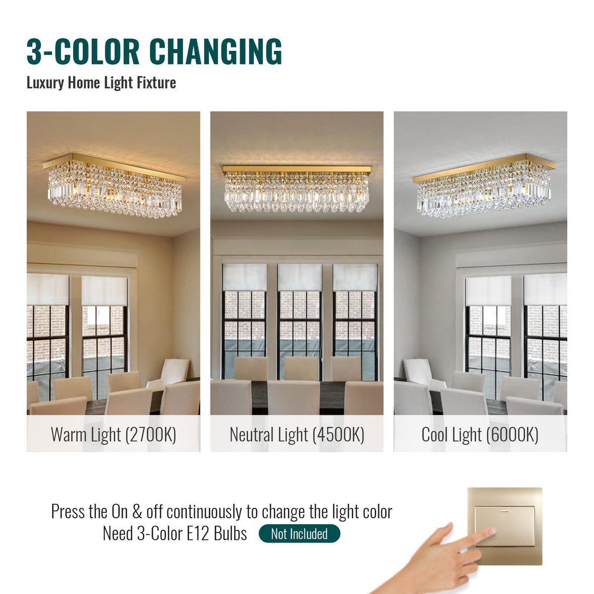 Q: What type of bulbs does the Siljoy 6 Lights Gold Rectangle Flush Mount Ceiling Light require?A: The Siljoy chandelier requires 6 x E12 bulbs with a maximum wattage of 40W each. For optimal lighting, we recommend using 3-Color E12 LED bulbs, which allow you to switch between warm, cool, and neutral light to create the perfect ambiance.