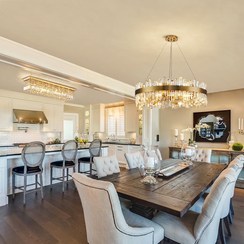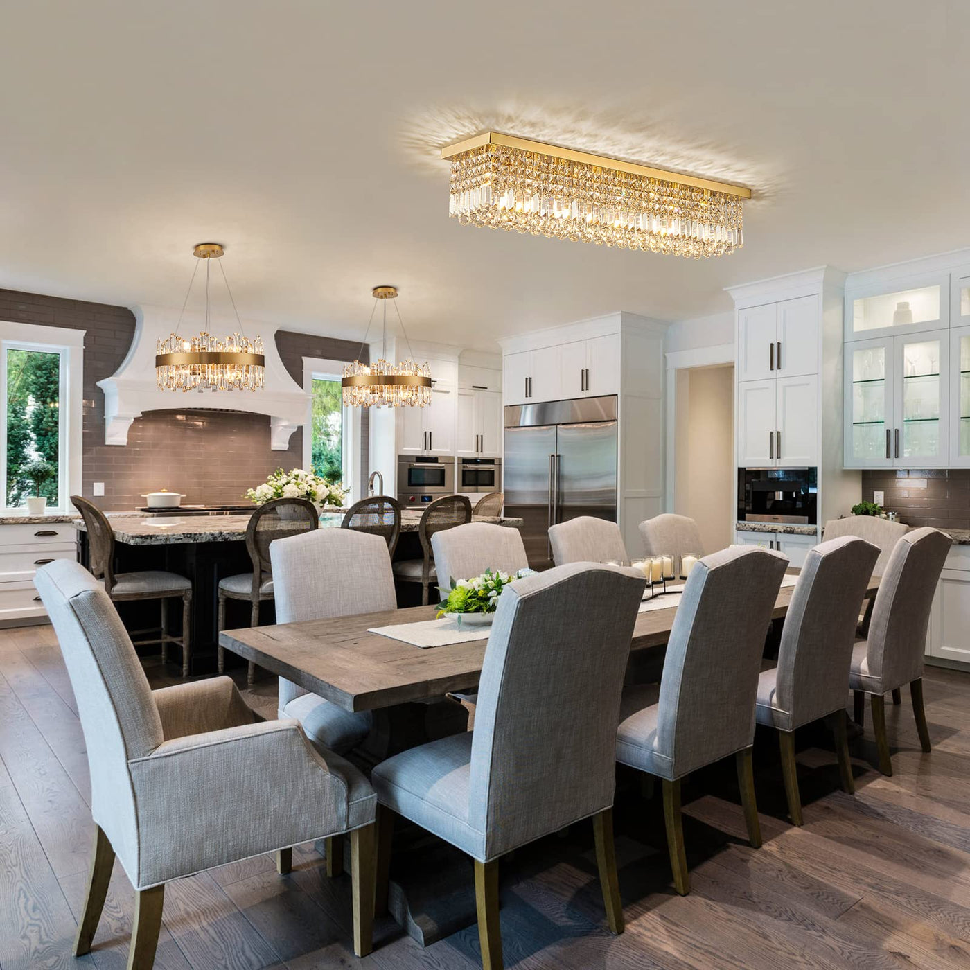 Q: In which spaces can this chandelier be effectively used?A: The modern gold flush mount chandelier is versatile and suitable for various spaces, including dining rooms, living rooms, kitchen islands, bedrooms, bathrooms, bars, hallways, entryways, and offices, adding a touch of luxury and elegance to any environment.
