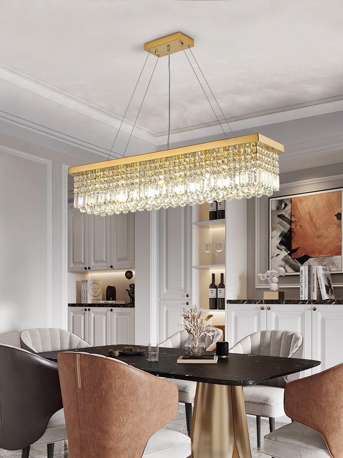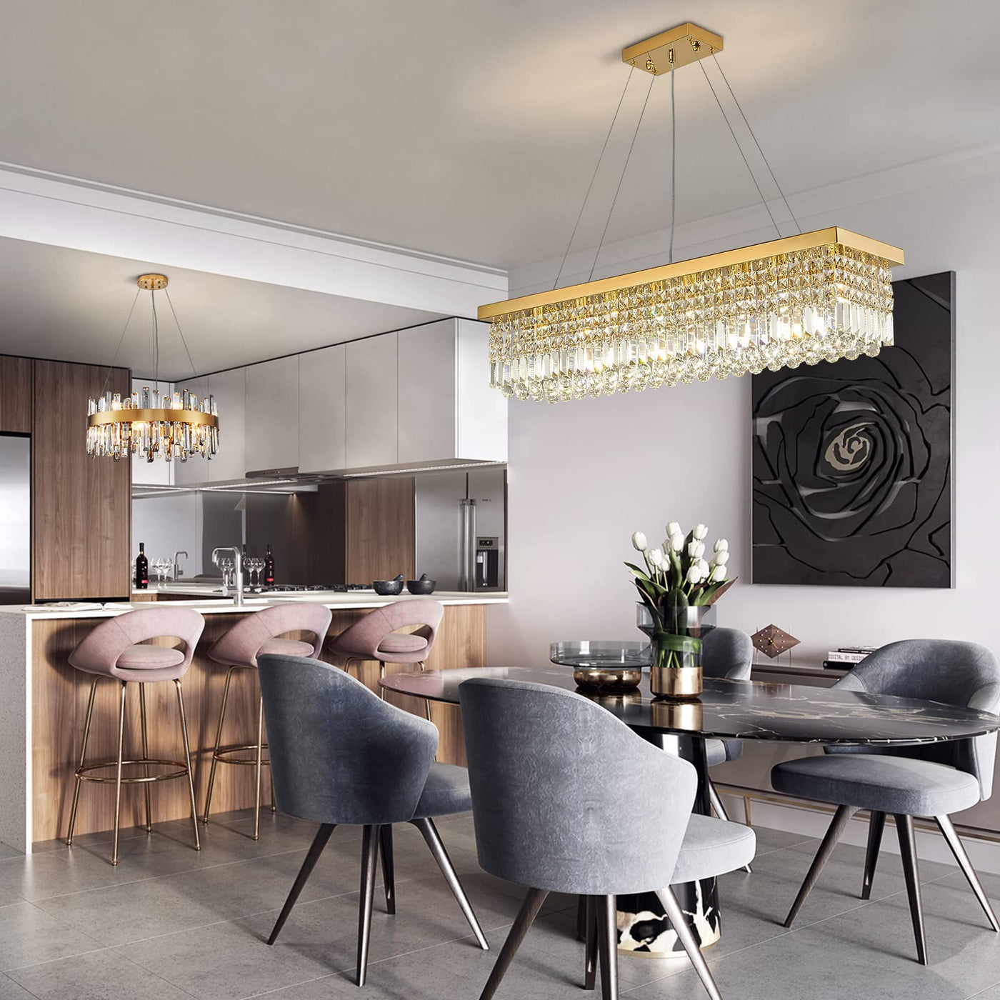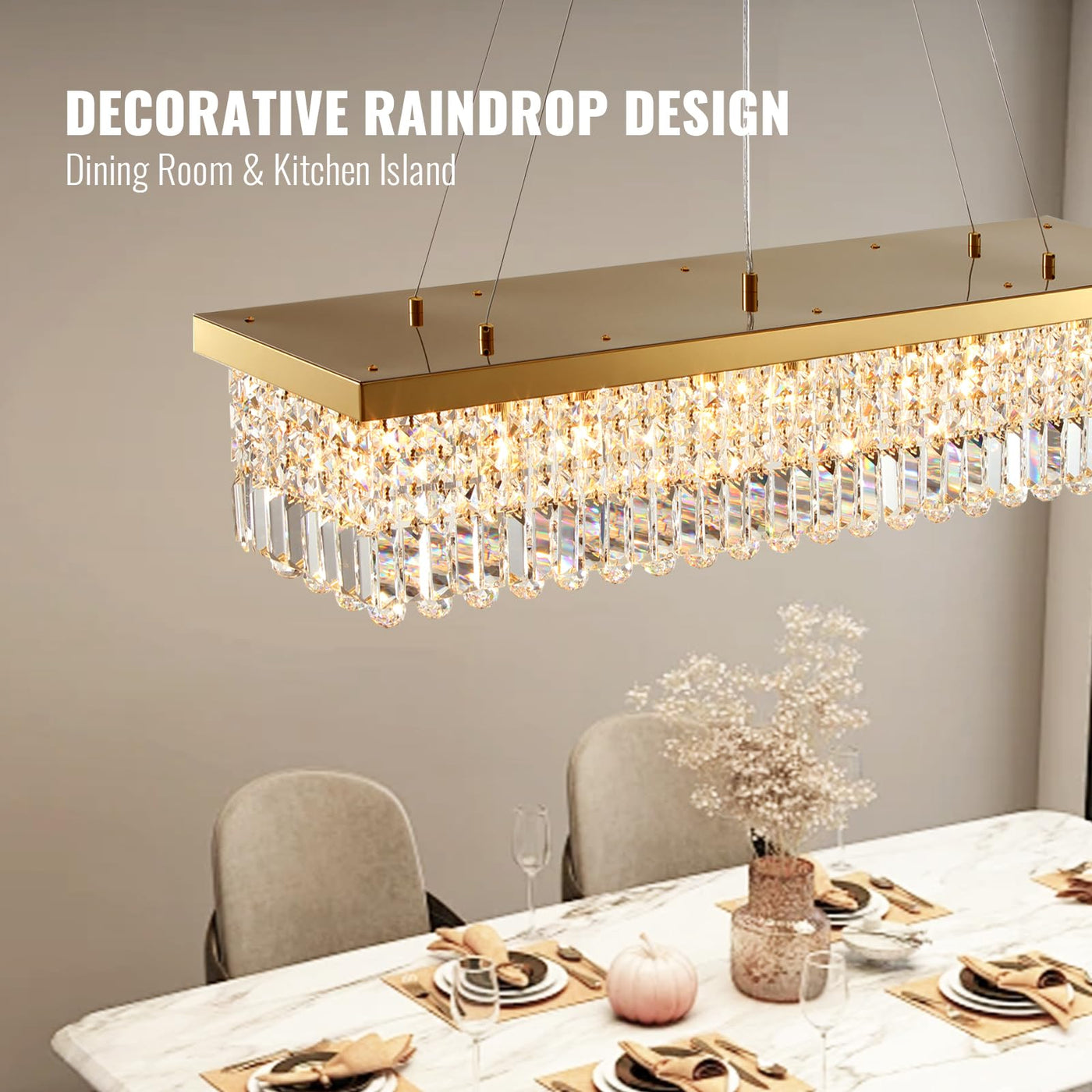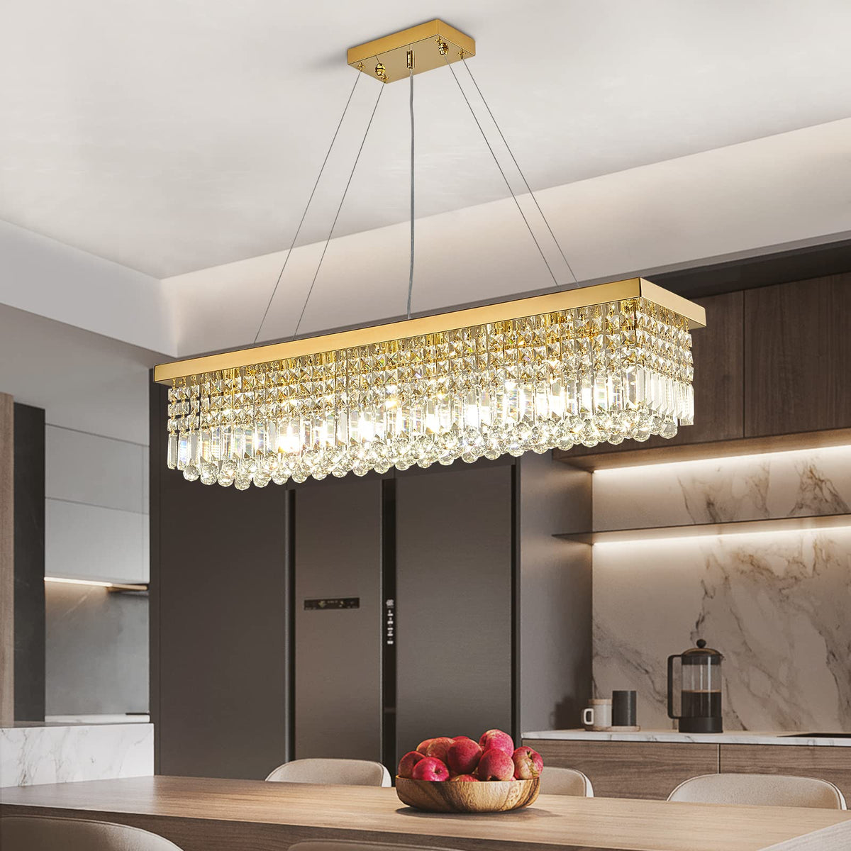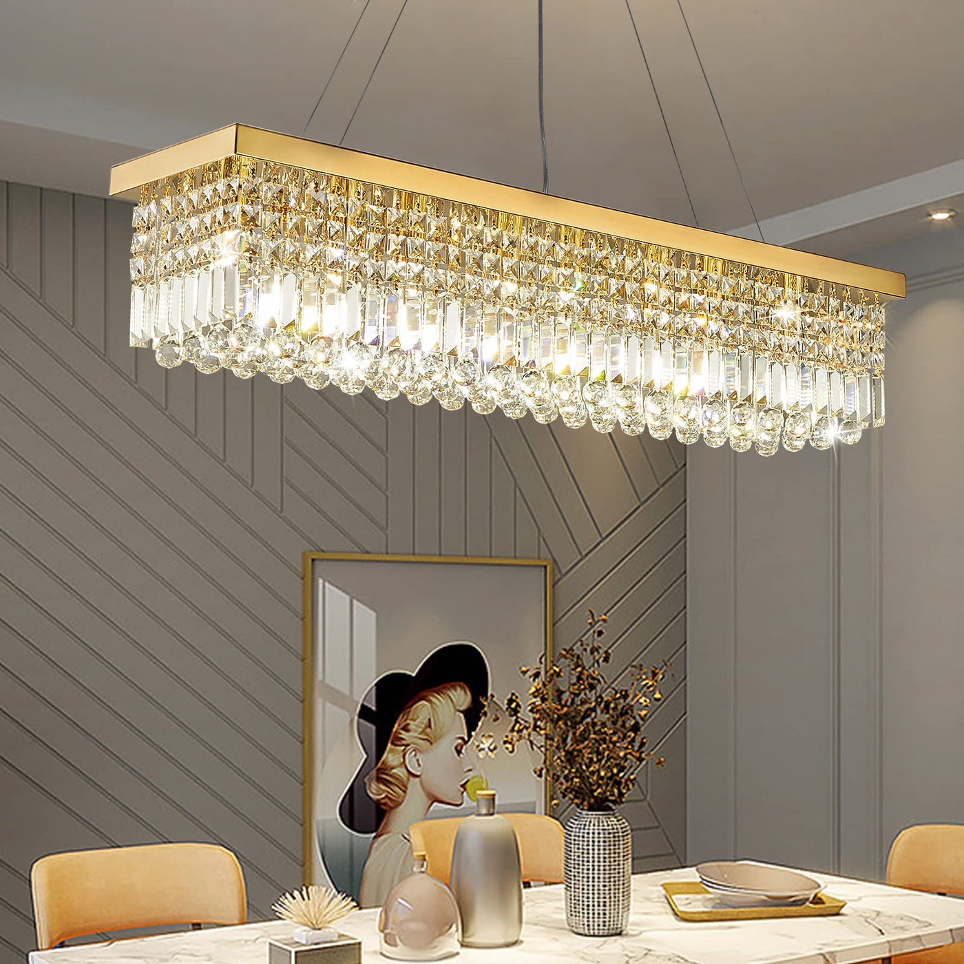 Siljoy 8-Light Modern Crystal Chandelier, Gold Rectangular Pendant For Dining Room & Kitchen