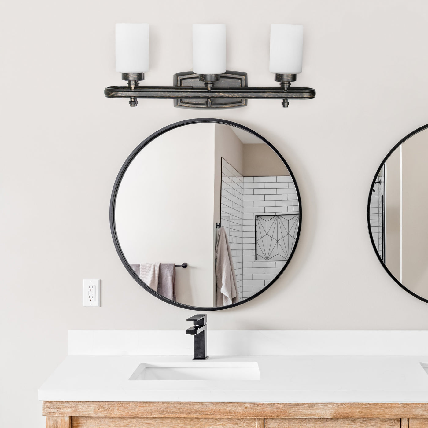 A modern piece of decor like this 3 light vanity fixture can simply transform your space into a beautiful brighter space. Available in a number of finish options the looping metal bar with matching backlplate holds three cylinder shaped milk white glass shades designed to match your space perfectly. Equipped to mount onto your wall as either an uplight or downlight this fixture will simply shine in more ways than one.