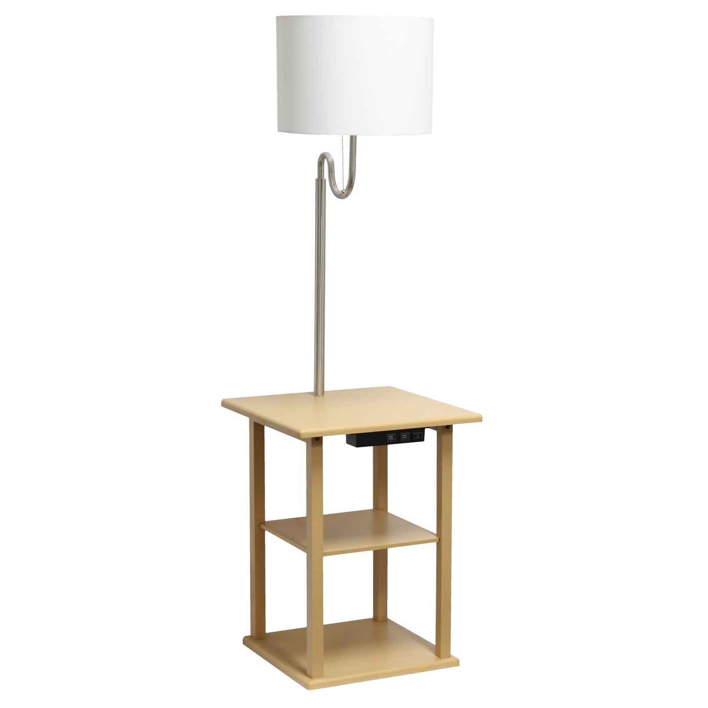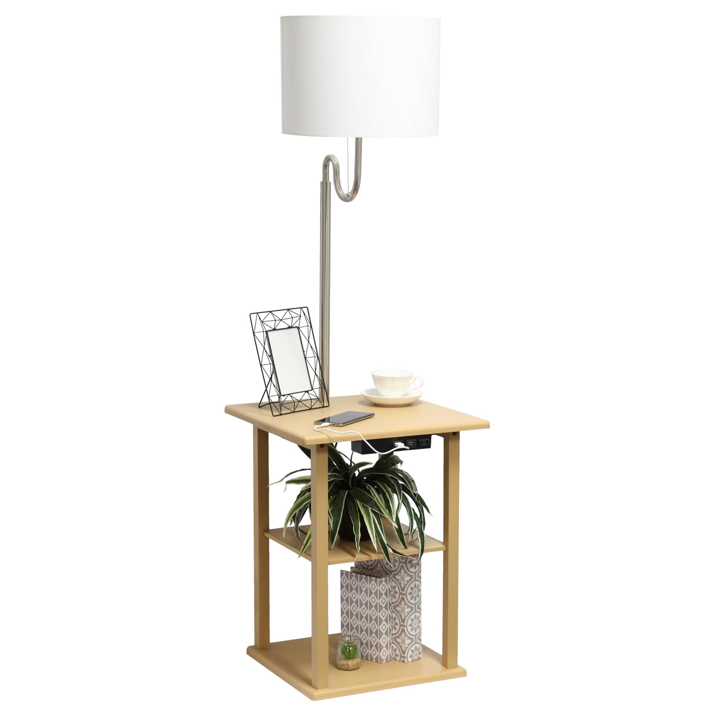 Simple Designs 57'' Modern 2 Tier End Table Floor Lamp Combination with 2 x USB Charging Ports & Power Outlet with White Drum Fabric Shade for Bedroom Living Room Office Dorm Dining Room Tan