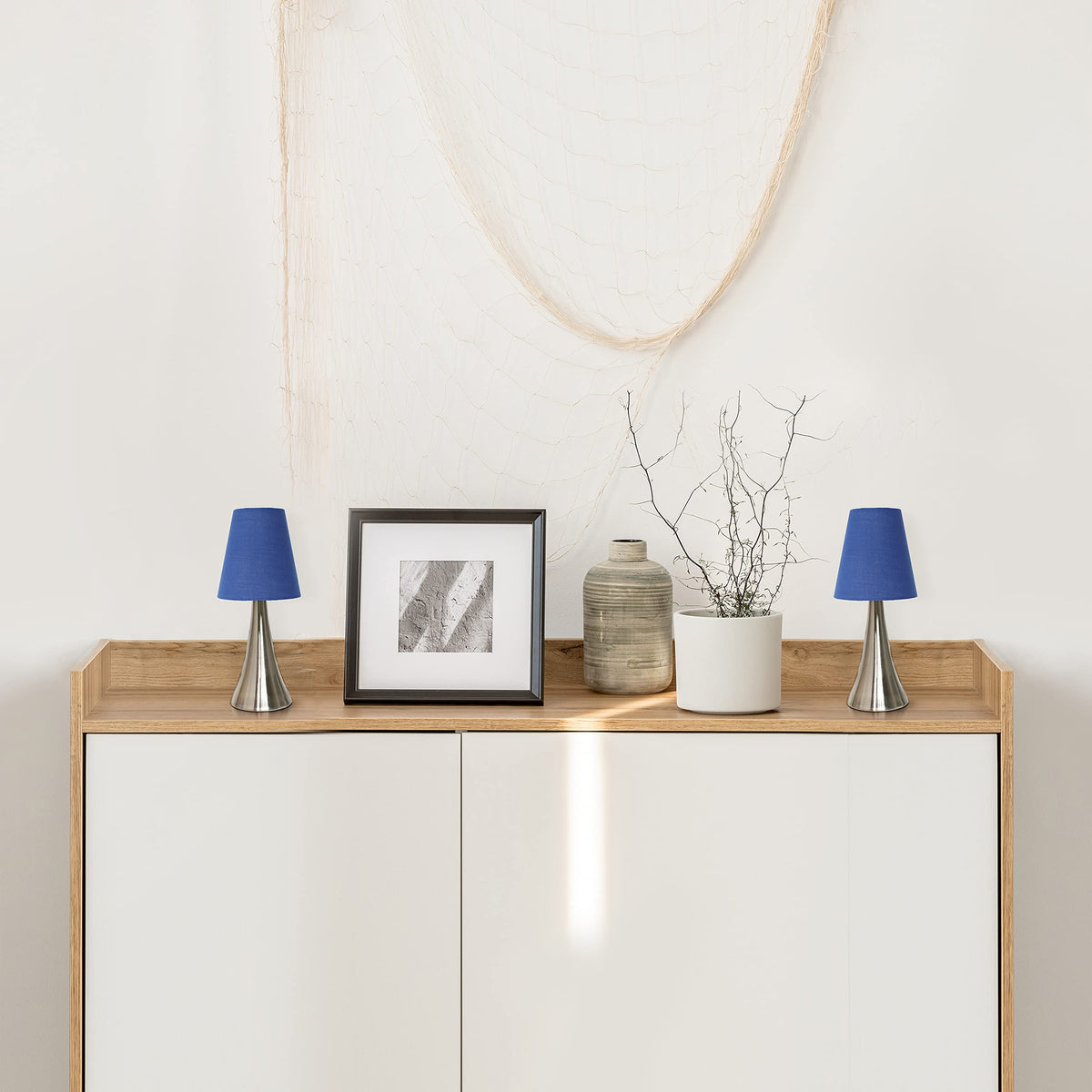 Simple Designs Blue Mini Touch Table Lamp Set, Brushed Nickel Base, 2 Pack, Fabric Shades