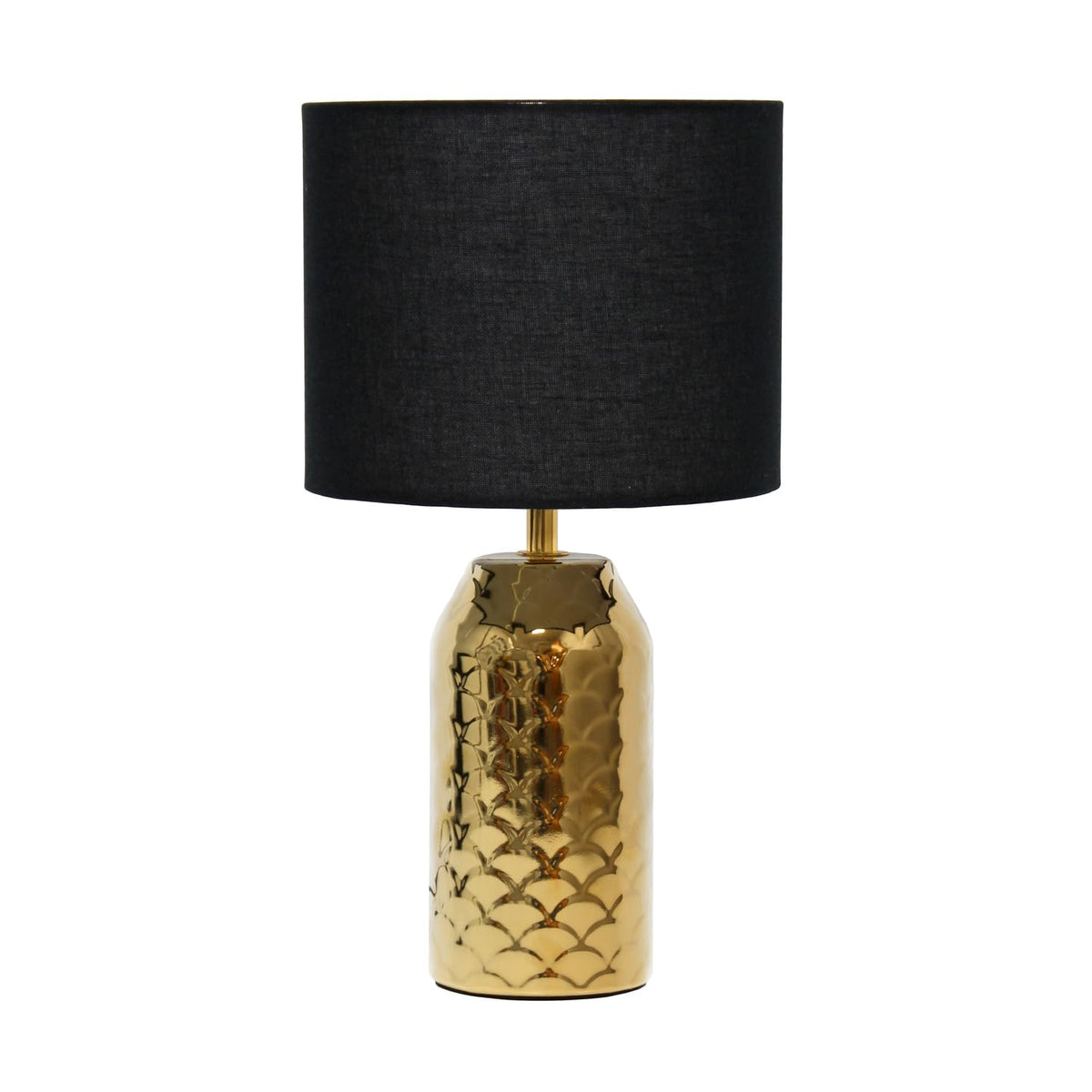 Q: What is the design style of the Simple Designs LT2123-GLD Table Lamp?A: This table lamp features a contemporary design with a striking fishscale-inspired pattern on the base and a black drum fabric shade, making it a chic accent piece for any room.