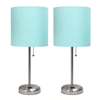 Simple Designs Lc2001-Aqu-2Pk Brushed Steel Stick Table Lamp Set With Charging Outlet And Aqua Fabric Shades, 2 Pack Set