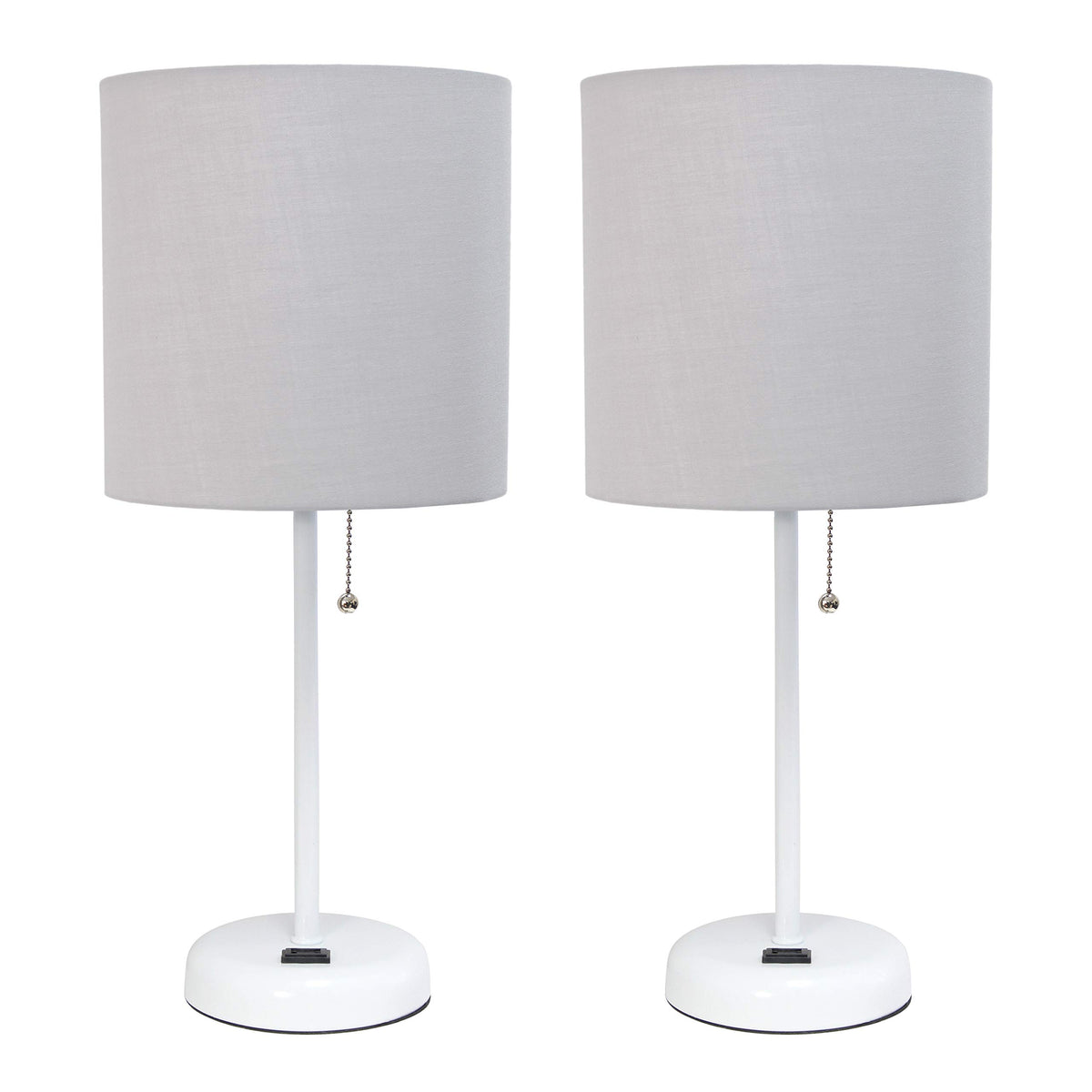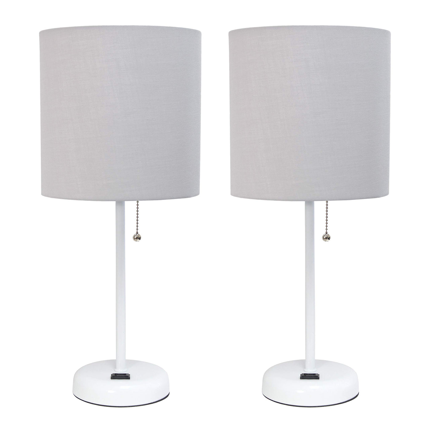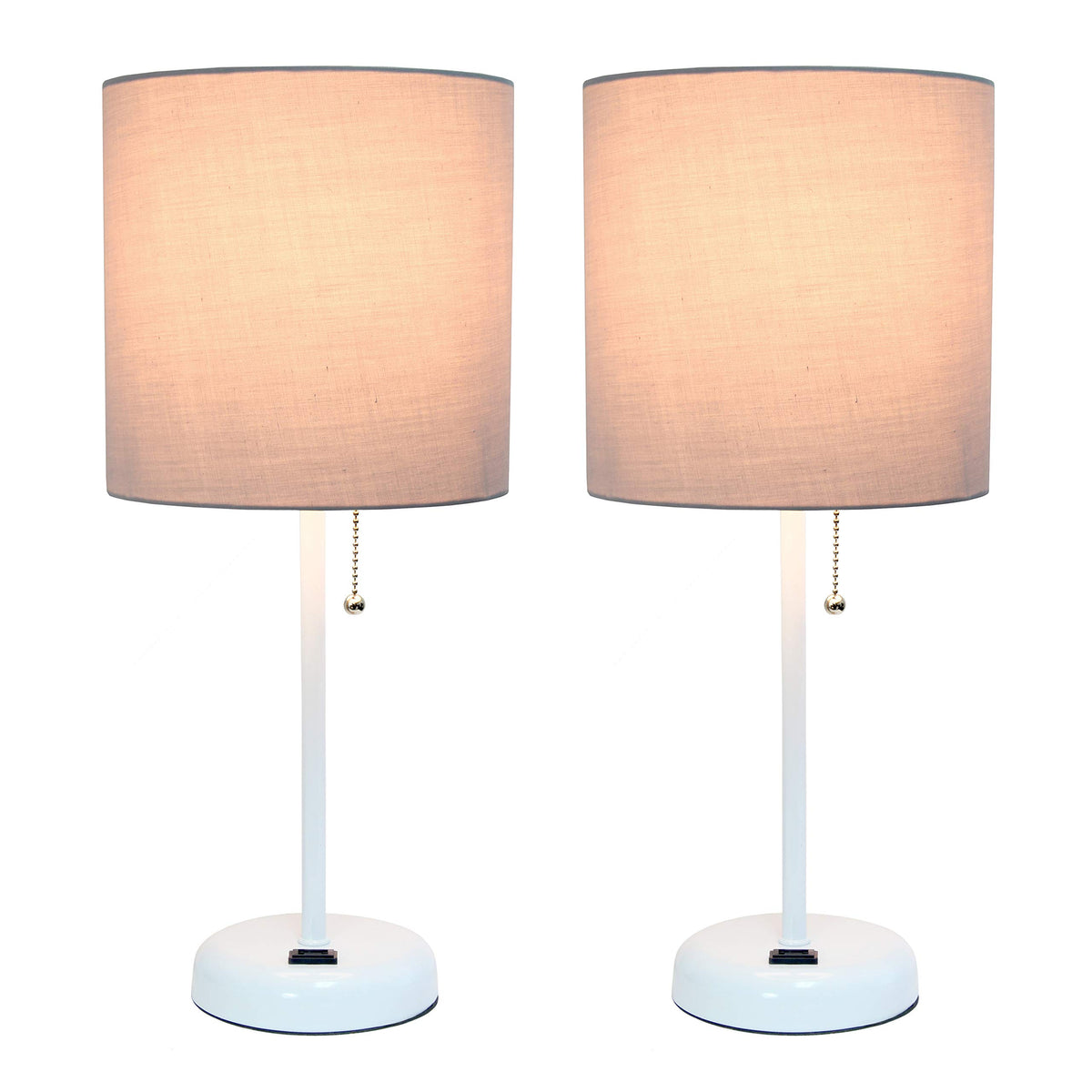 Simple Designs Lc2001-Gow-2Pk White Stick Table Lamp Set With Charging Outlet And Gray Fabric Shades, 2 Pack Set