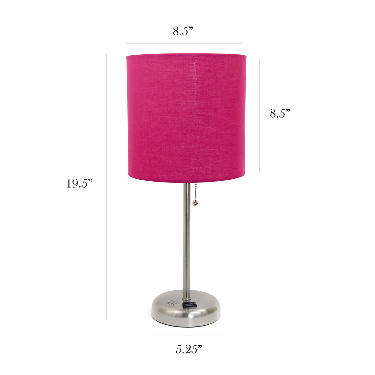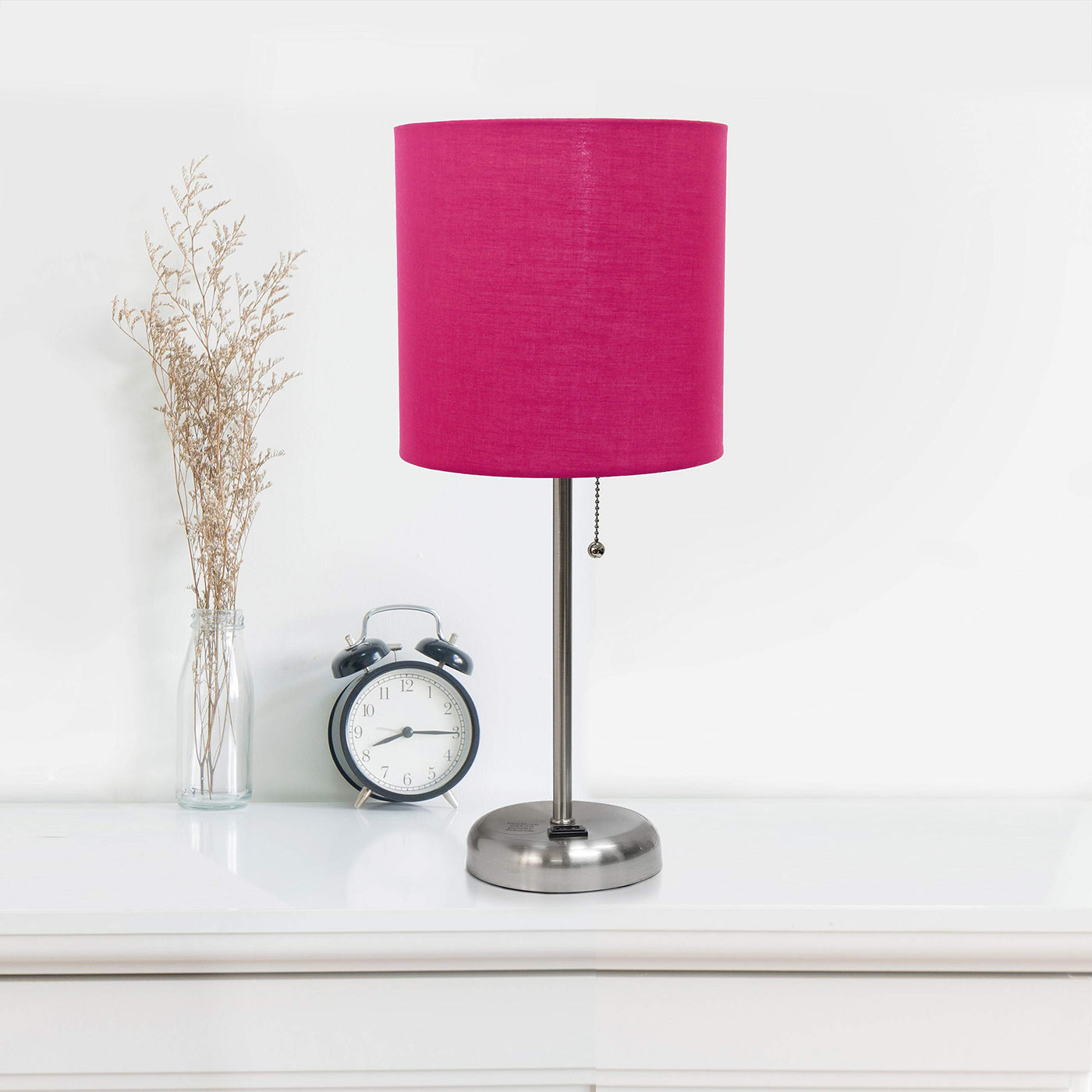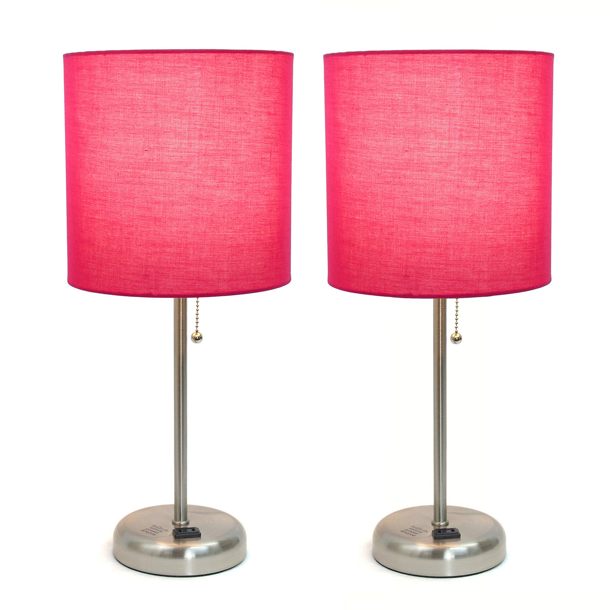 Simple Designs Lc2001-Pnk-2Pk Brushed Steel Stick Table Lamp Set With Charging Outlet And Pink Fabric Shades, 2 Pack Set