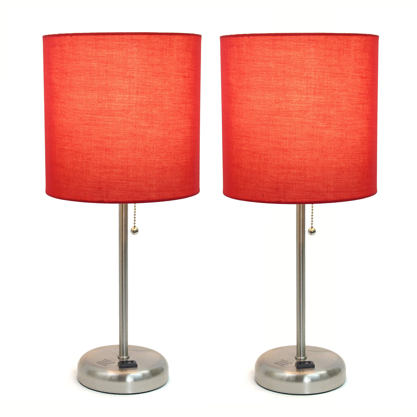 This fun and fashionable lamp set features 2 brushed steel bases and a pair of red fabric shades. Each lamp comes equipped with a 2 prong outlet seated in the base for use to charge mobile phones, handheld games, tablets, and other small electronics. These lamps will add fabulous flair to any room. Perfect for bedrooms, kids and teens, college dorms, nurseries, or fun offices!