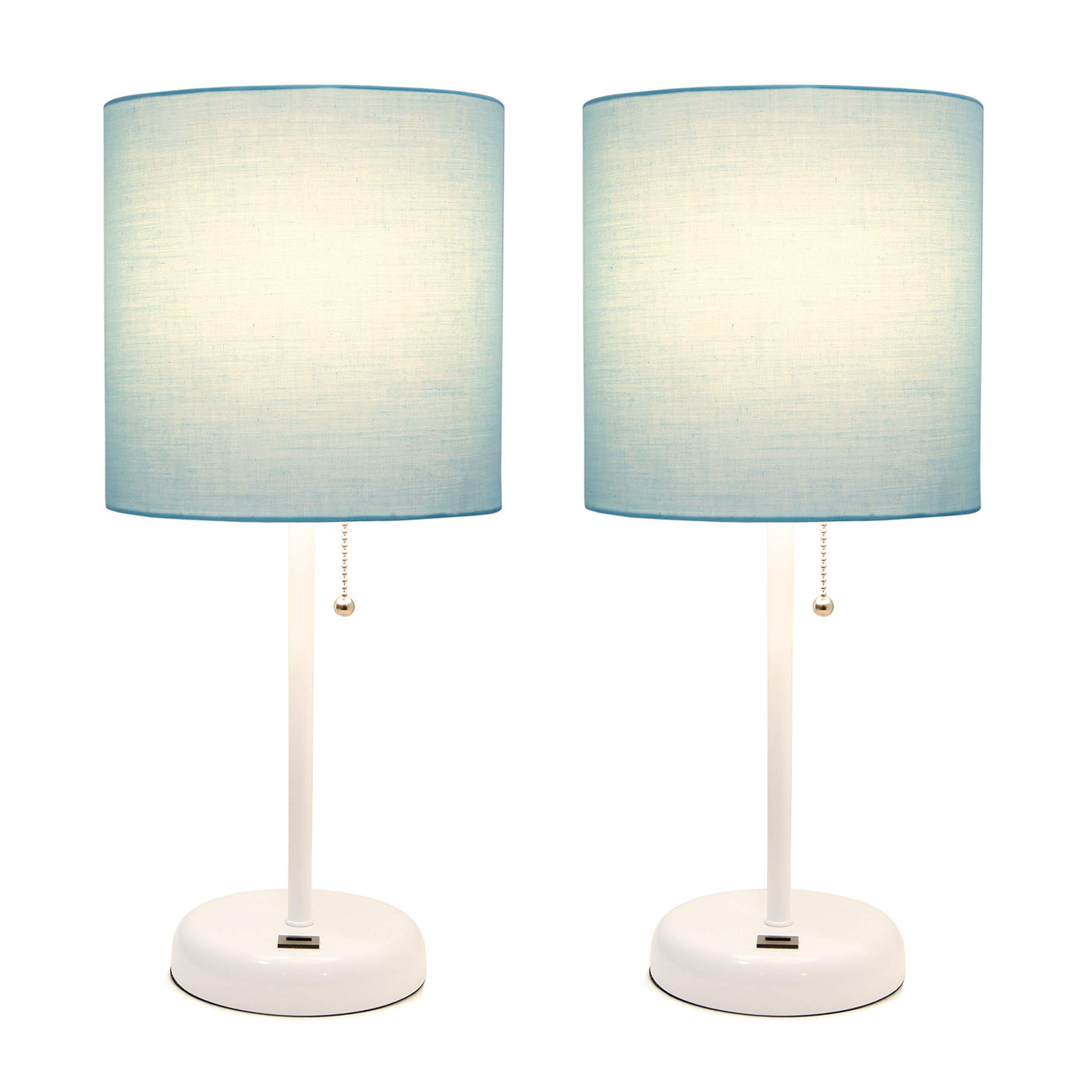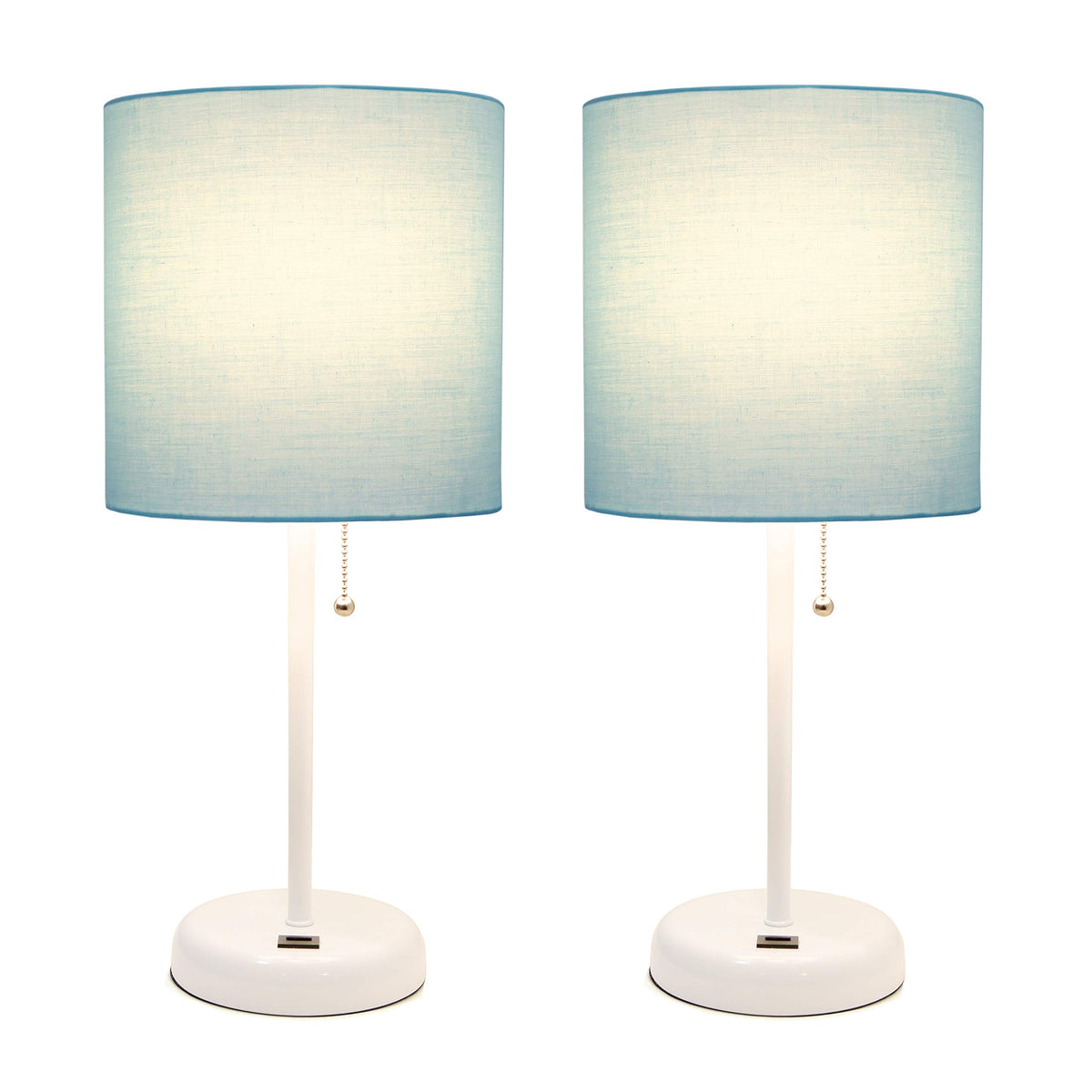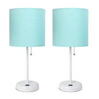 Simple Designs Lc2002-Aow-2Pk White Stick Table Lamp Set With Usb Charging Port And Aqua Fabric Shades, 2 Pack Set