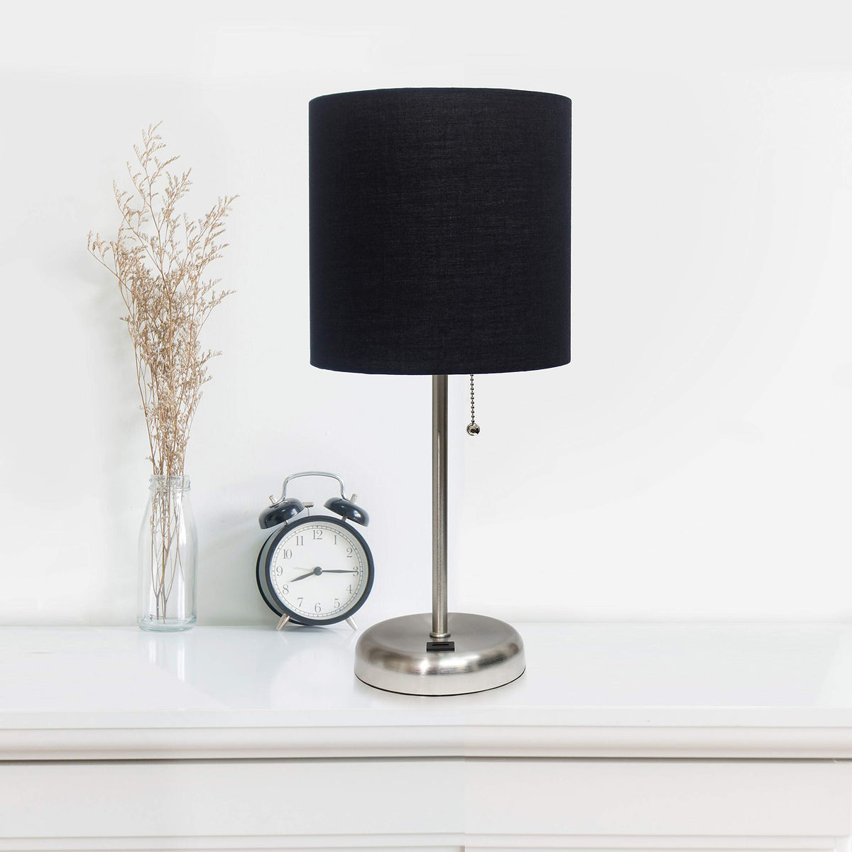 Simple Designs Lc2002-Blk-2Pk Brushed Steel Stick Table Lamp Set With Usb Charging Port And Black Fabric Shades, 2 Pack Set