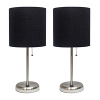 This fun and fashionable lamp set features 2 brushed steel bases and a pair of black fabric shades. Each lamp comes equipped with a USB seated in the base for use to charge mobile phones, handheld games, tablets, and other small electronics. This two piece table lamp set will add a touch of fabulous flair to any room. Perfect for bedrooms, kids and teens, college dorms, nurseries, or fun offices!