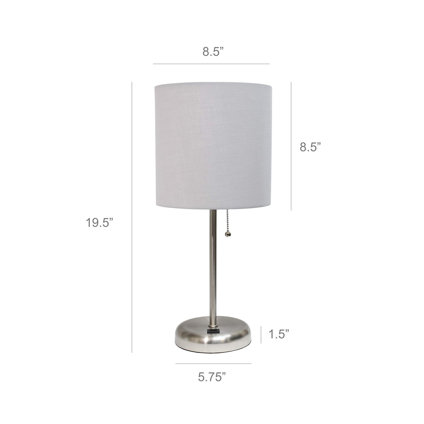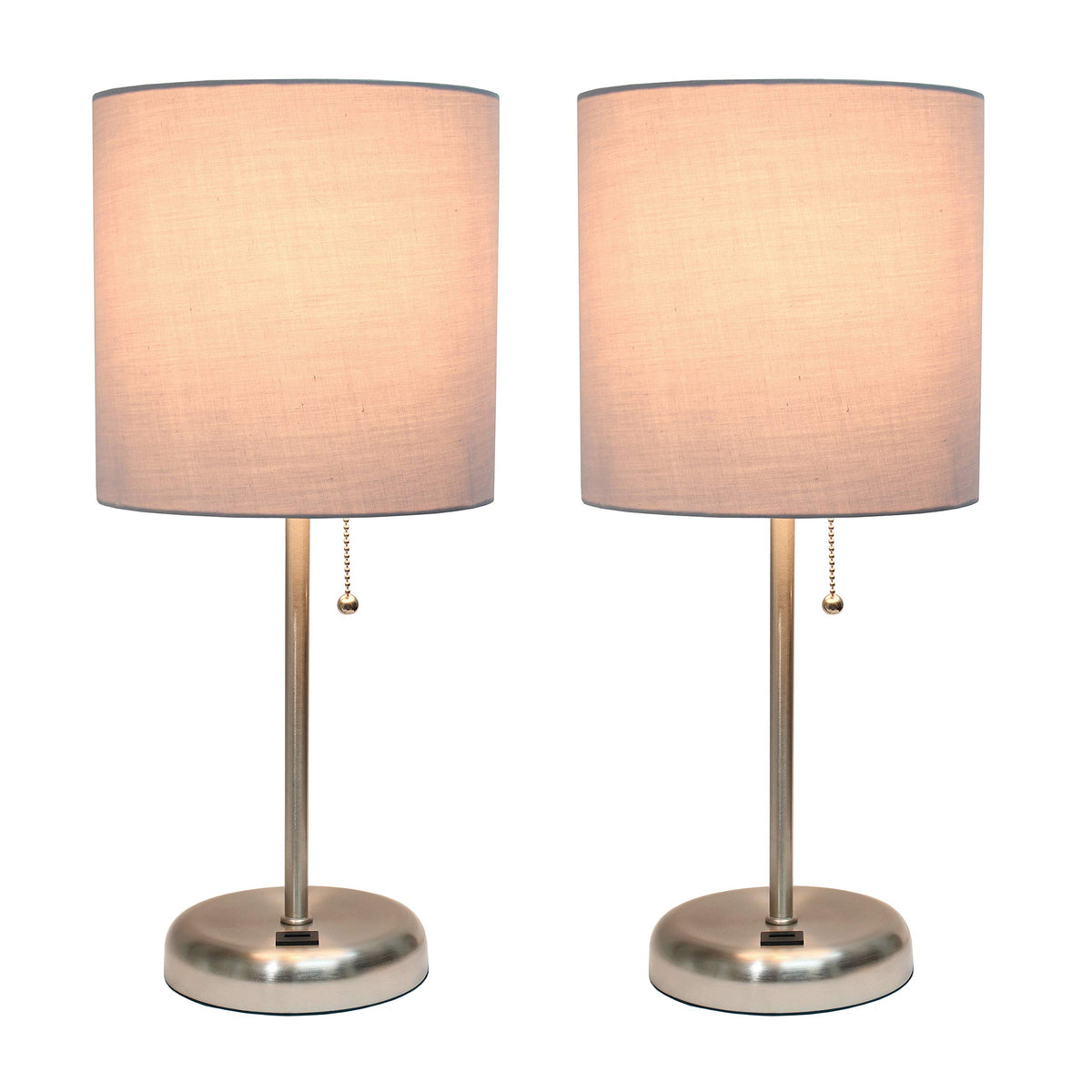 Simple Designs Lc2002-Gry-2Pk Brushed Steel Stick Table Lamp Set With Usb Charging Port And Gray Fabric Shades, 2 Pack Set