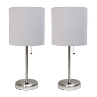 This fun and fashionable lamp set features 2 brushed steel bases and a pair of gray fabric shades. Each lamp comes equipped with a USB seated in the base for use to charge mobile phones, handheld games, tablets, and other small electronics. This two piece table lamp set will add a touch of fabulous flair to any room. Perfect for bedrooms, kids and teens, college dorms, nurseries, or fun offices!