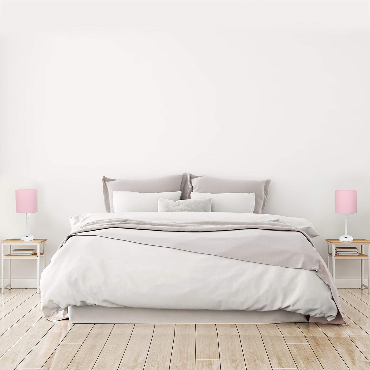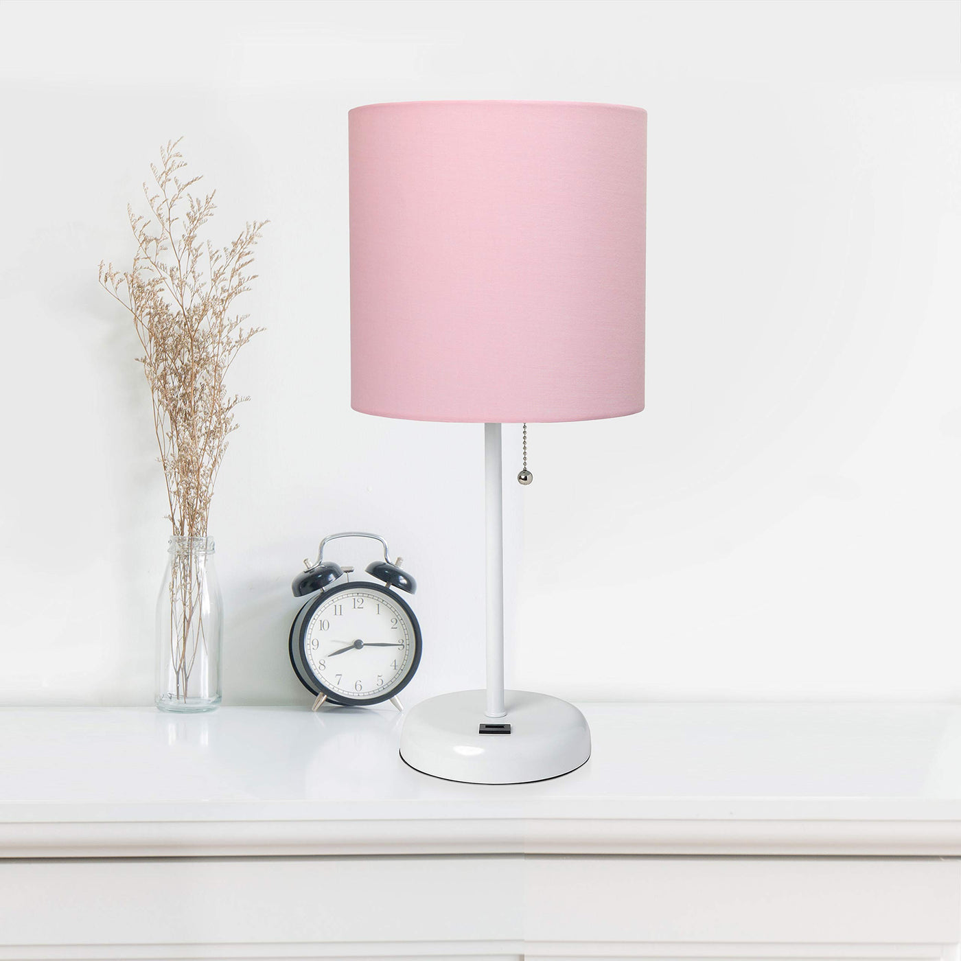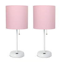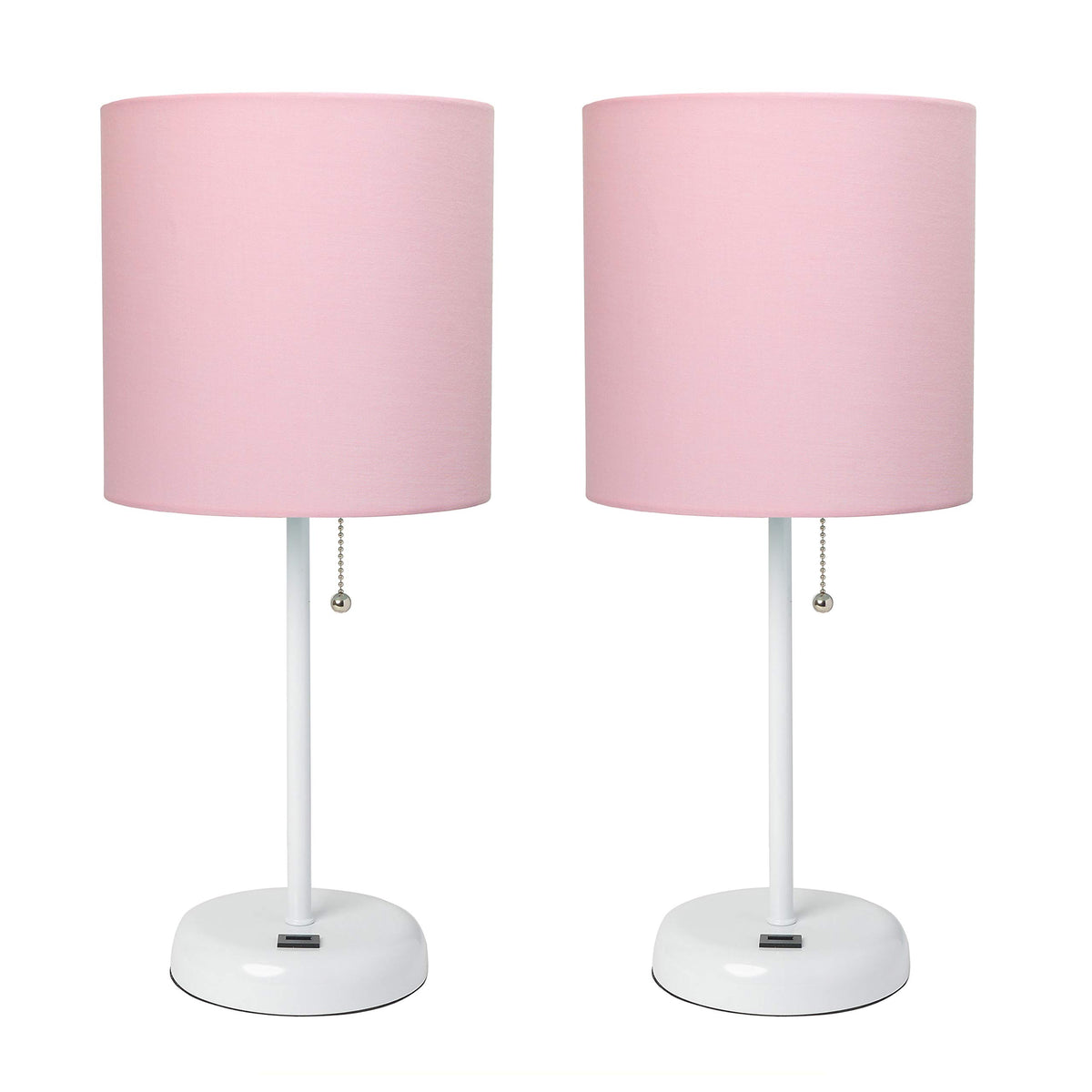 Simple Designs Lc2002-Pow-2Pk White Stick Table Lamp Set With Usb Charging Port And Light Pink Fabric Shades, 2 Pack Set
