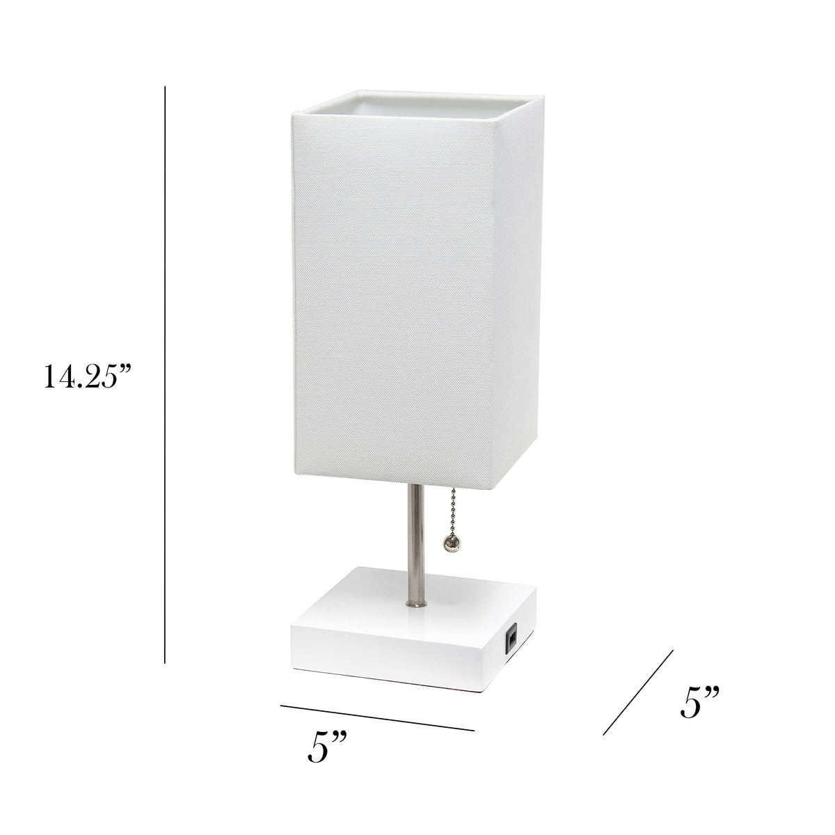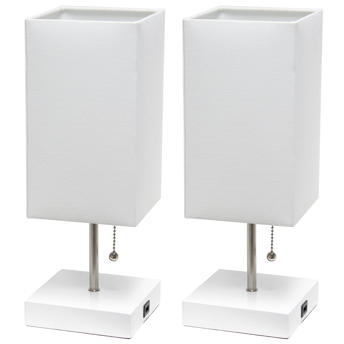 White base with USB charging port on base for charging your phone or other devices. | Rectangular fabric shade with brushed steel accent pole/chain | 2 table lamps in set | Uses 1 x 40W equivalent type A medium base bulb (not included) | Pull chain on/off switch located on socket