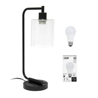 Simple Designs Ld1066-Blk-Lb Industrial Vintage Bronson Iron Lantern Desk Table Lamp With Usb Port And Glass Cylinder Shade For Office, Living Room, Bedroom, Black, With Feit Led Bulb Included