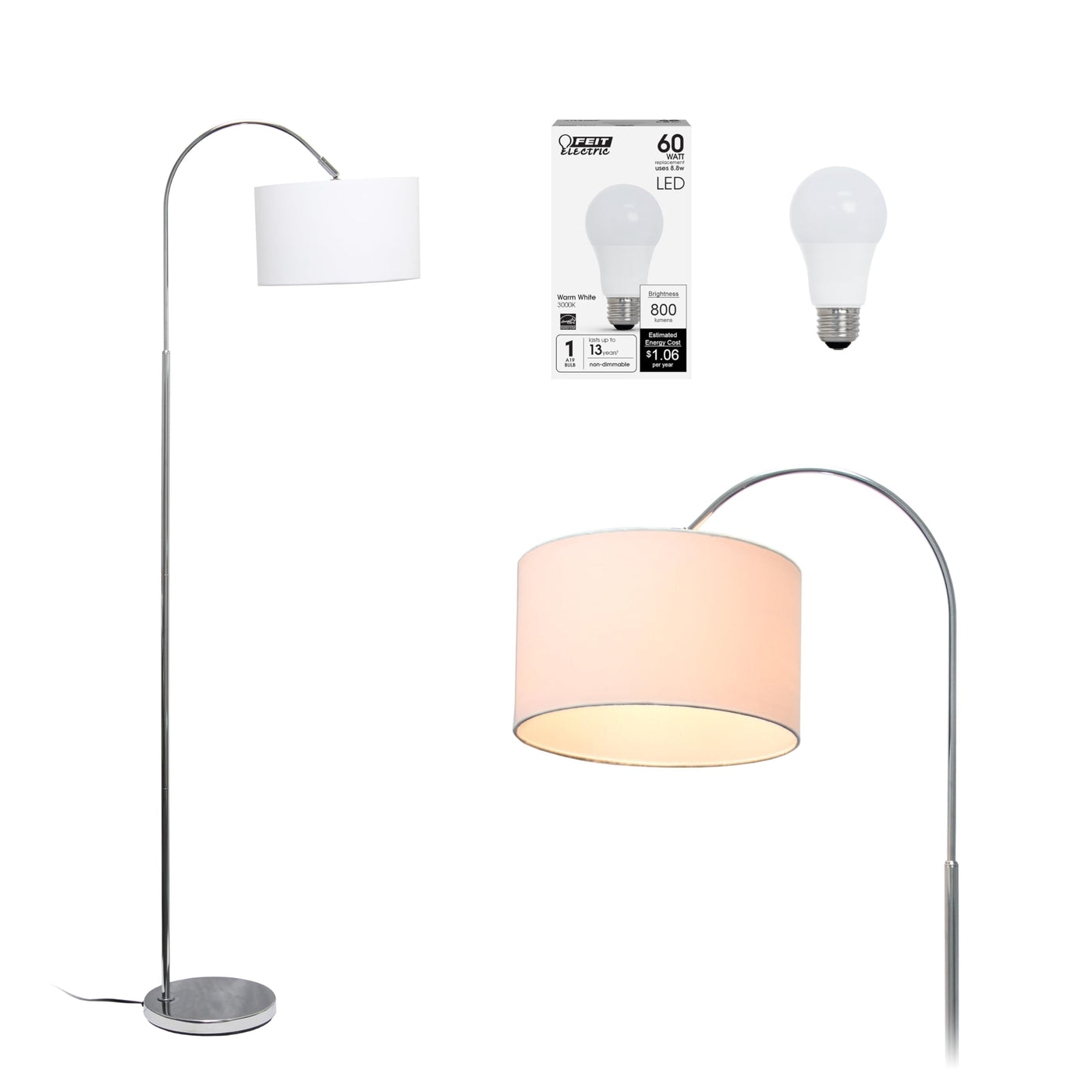 MODERN DESIGN: An arched brushed nickel base is paired with a white fabric drum shade for a modern, refined look suitable for your living room, bedroom, office, or foyer! | LED BULB INCLUDED: This floor lamp includes 1 x 60W equivalent Type A19 LED Bulb, 8.8W, Warm White 3000K, 800 Lumens | SWITCH SETTINGS: An easily accessible foot switch is located on the cord of this floor lamp to allow a quick and easy on/off function as needed. Lamp is also equipped with a 6 foot black plug in cord rooted at the base. | ASSEMBLY REQUIRED: Full assembly is required for this floor lamp, prior to its first use. A step by step manual is provided for easy assembly! | PRODUCT SIZE: Overall product size is L: 11" x W: 27" x H: 66" and weighs 8.18 lbs.