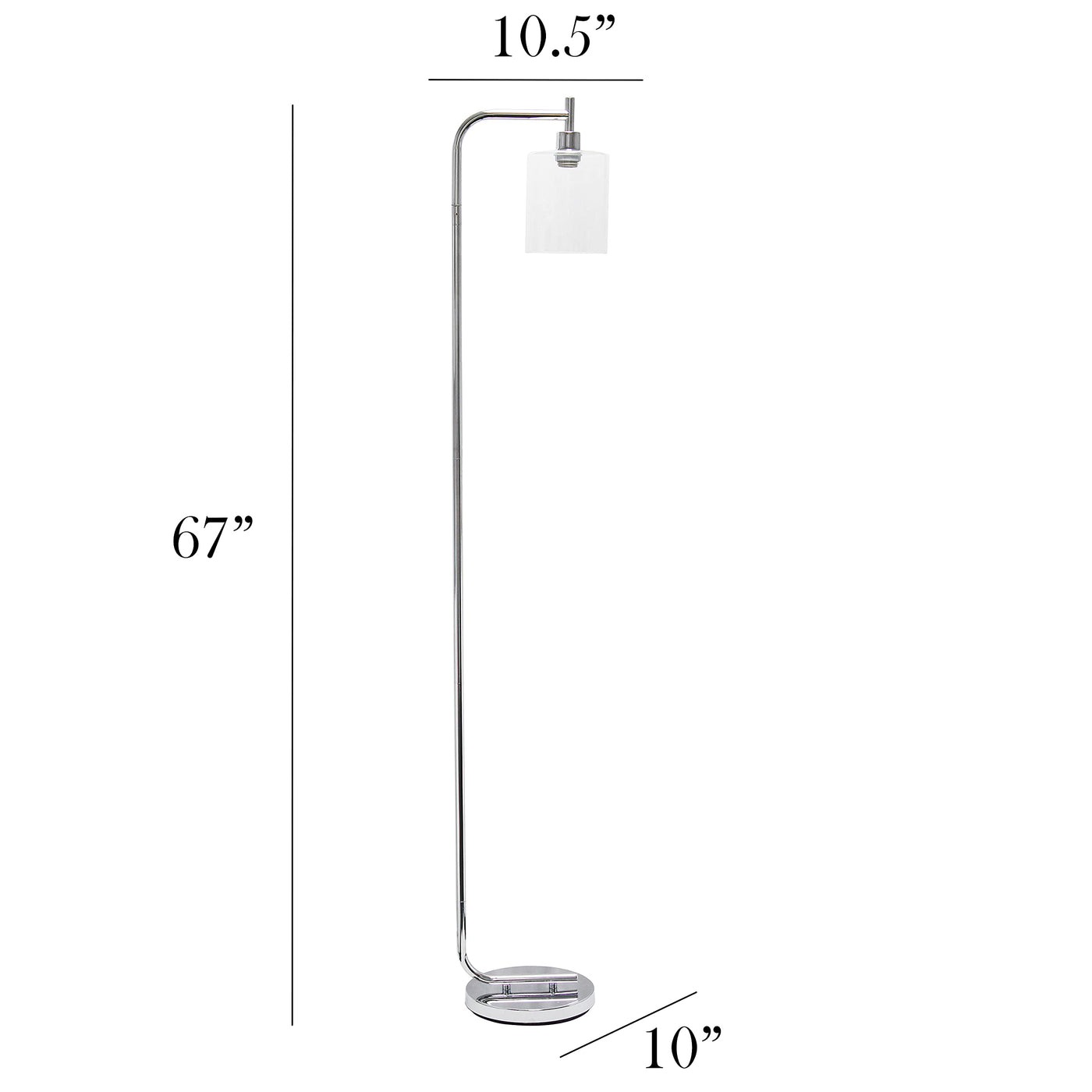 Chrome finish | Clear glass cylindrical shade | Uses 1 x 60W equivalent Type A medium base bulb (not included) | Easy to use on/off floor switch on cord | Some Assembly Required