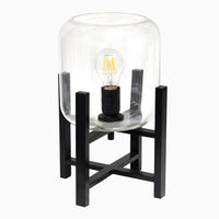 Q: What materials are used in the construction of this table lamp?A: The lamp has a black wood base and a clear glass shade, combining durability with a stylish design.
