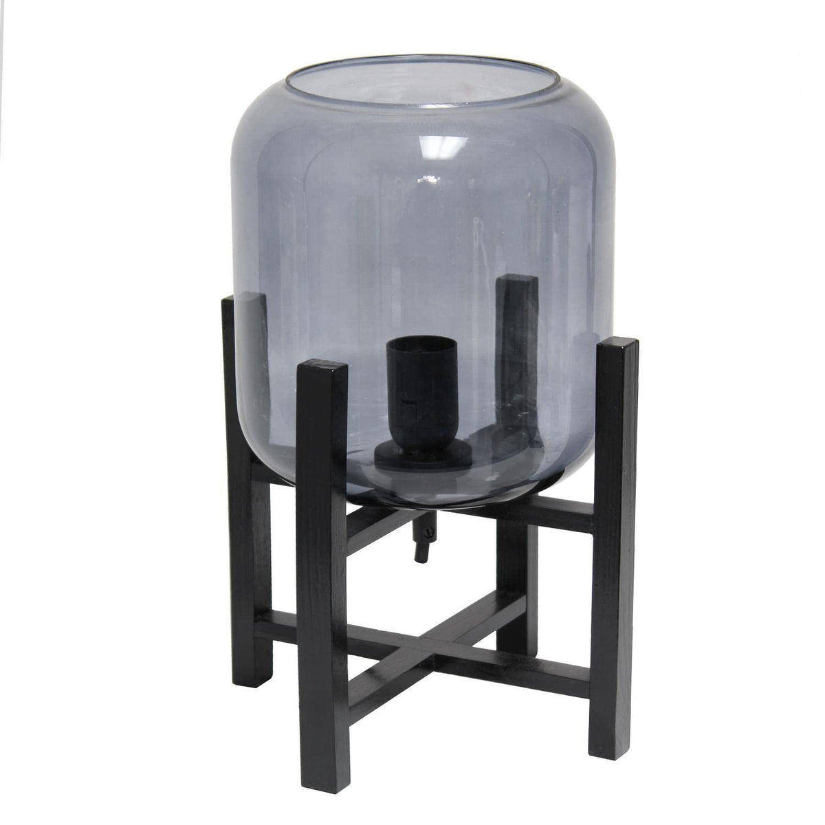 This contemporary lamp elevates the glass shade on a four-arm wood stand finished in black. The curvy cylindrical smokey glass shade combined with the geometric wood base creates the perfect ensemble. Place on a desk, nightstand, dresser or table for a modest, refined look in fashion lighting. HELPFUL TIP: To get the complete vintage look, we recommend using a decorative Edison/Vintage bulb (not included).