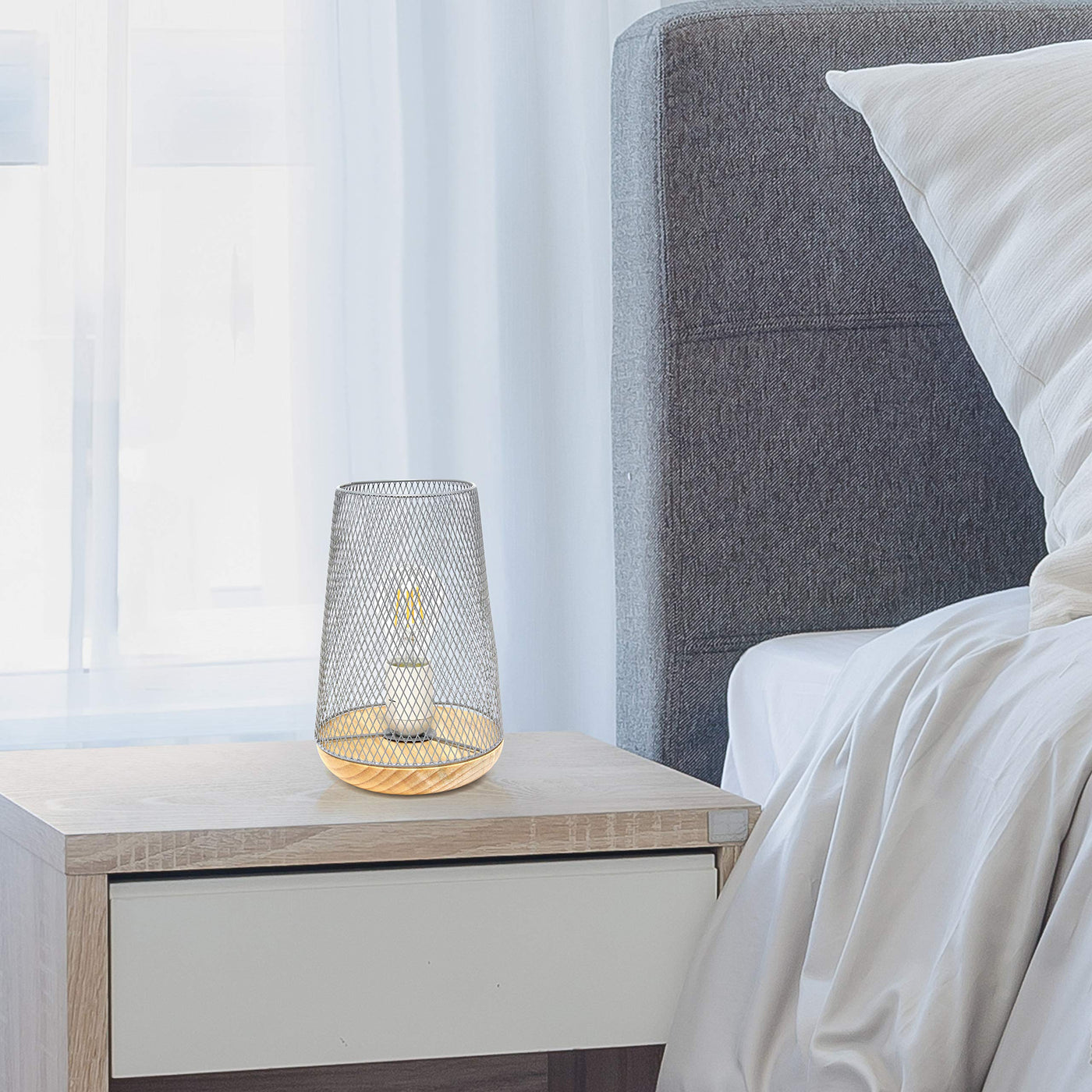 Q: What materials is the lamp made from?A: The lamp features a natural wood base and a gray mesh metal shade, combining durability with a stylish design.