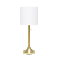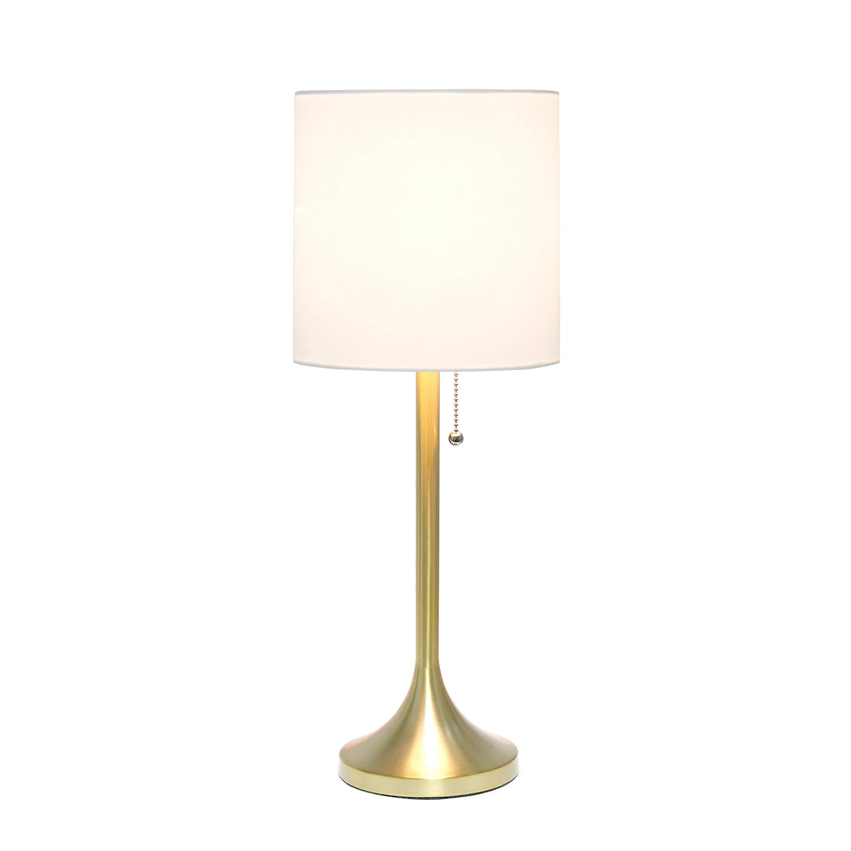 Gold metal base | White fabric shade | Pull chain on/off switch | Uses 1 x 40W medium type A19 base bulb (not included) | Available in additional base and/or shade color options