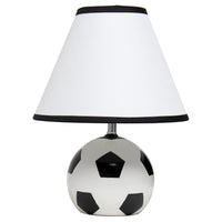 FUN SPORTS STYLED LAMP: A neutral lamp to accommodate all soccer teams' décor, memorabilia spaces, man cave rooms, and more! This lamp features a realistic soccer ball shaped base with a matching black trim and white fabric shade. | ACCESSIBLE SWITCH: An easily accessible gear (rotary) switch is located on the cord of this table lamp to allow a quick and easy on/off function as needed. Lamp is also equipped with a 5 foot white plug in cord rooted at the base. | PRODUCT SIZE: Overall product size is L: 9" x W: 9" x H: 11.5" and weighs 1.54 lbs. The shade of this lamp measures Dia: 9" x H: 6.75" | ASSEMBLY & USE: Product ships assembled and will only require you to secure the lamp shade to the base using the provided socket nut prior to use. | BULB REQUIREMENT SOLD SEPARATELY: This table lamp uses 1 x 40 watt equivalent type A19 E26 medium base bulb, which is not included in your purchase but can be easily found online or your local hardware store.