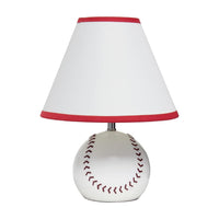FUN SPORTS STYLED LAMP: A neutral lamp to accommodate all baseball teams' décor, memorabilia spaces, man cave rooms, and more! This lamp features a realistic baseball shaped base with a matching red trim and white fabric shade. | ACCESSIBLE SWITCH: An easily accessible gear (rotary) switch is located on the cord of this table lamp to allow a quick and easy on/off function as needed. Lamp is also equipped with a 5 foot white plug in cord rooted at the base. | PRODUCT SIZE: Overall product size is L: 9" x W: 9" x H: 11.5" and weighs 1.54 lbs. The shade of this lamp measures Dia: 9" x H: 6.75" | ASSEMBLY & USE: Product ships assembled and will only require you to secure the lamp shade to the base using the provided socket nut prior to use. | BULB REQUIREMENT SOLD SEPARATELY: This table lamp uses 1 x 40 watt equivalent type A19 E26 medium base bulb, which is not included in your purchase but can be easily found online or your local hardware store.