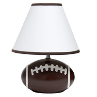 FUN SPORTS STYLED LAMP: A neutral lamp to accommodate all football teams' décor, memorabilia spaces, man cave rooms, and more! This lamp features a realistic football shaped base with a matching brown trim and white fabric shade. | ACCESSIBLE SWITCH: An easily accessible gear (rotary) switch is located on the cord of this table lamp to allow a quick and easy on/off function as needed. Lamp is also equipped with a 5 foot white plug in cord rooted at the base. | PRODUCT SIZE: Overall product size is L: 9" x W: 9" x H: 11.5" and weighs 1.65 lbs. The shade of this lamp measures Dia: 9" x H: 6.75" | ASSEMBLY & USE: Product ships assembled and will only require you to secure the lamp shade to the base using the provided socket nut prior to use. | BULB REQUIREMENT SOLD SEPARATELY: This table lamp uses 1 x 40 watt equivalent type A19 E26 medium base bulb, which is not included in your purchase but can be easily found online or your local hardware store.