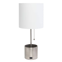 This fun and fashionable lamp features a brushed nickel hammered metal base and a white fabric shade. It comes equipped with a USB seated in the base for use to charge mobile phones, handheld games, tablets, and other small electronics. This lamp will add a fabulous flair to any room. Perfect for bedrooms, kids and teens, college dorms, nurseries, or fun offices