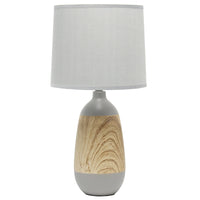 Q: What materials are used in the construction of this table lamp?A: This table lamp features a gray ceramic base with a light wooden print and a matching gray fabric shade, combining durability with modern aesthetics.