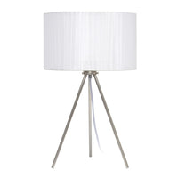 Elevate your contemporary decor with this sleek and modern three-legged brushed nickel table lamp. This table lamp seamlessly combines form and function, providing both a stylish statement piece and a practical lighting solution for your modern living space.