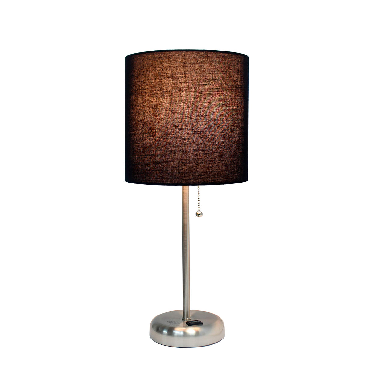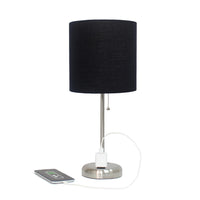 Simple Designs Lt2024-Blk Brushed Steel Stick Table Desk Lamp With Charging Outlet And Drum Fabric Shade, Black Shade