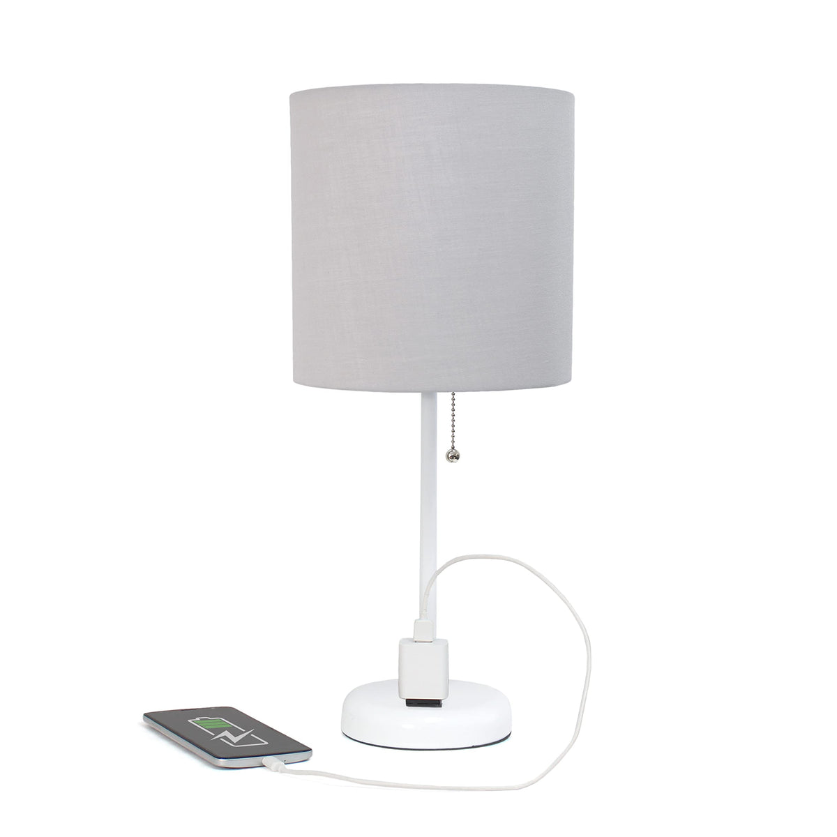 Simple Designs Lt2024-Gow White Stick Table Desk Lamp With Charging Outlet And Drum Fabric Shade, Gray Shade (Pack Of 2)