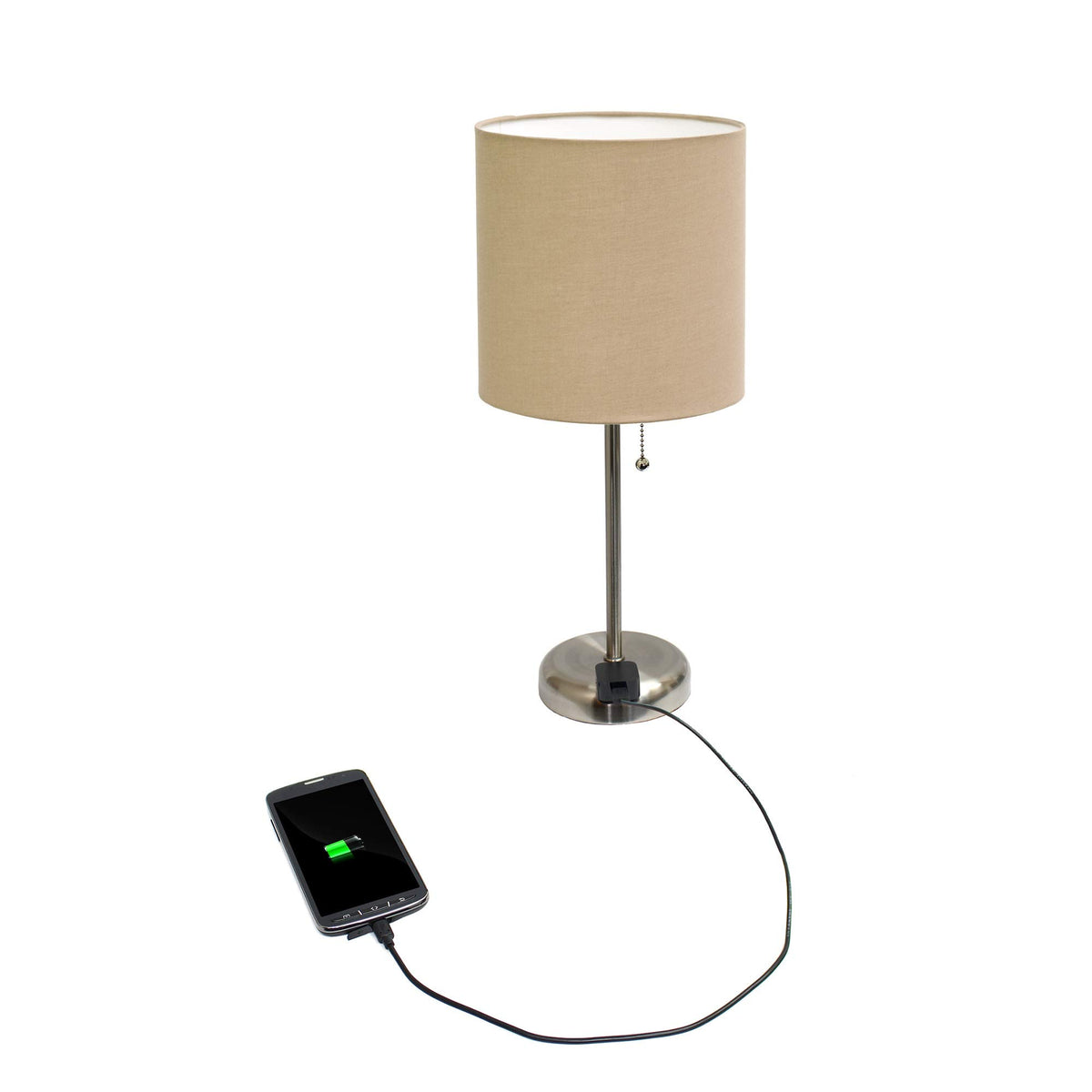Simple Designs Lt2024-Tan Brushed Steel Stick Table Desk Lamp With Charging Outlet And Drum Fabric Shade, Tan