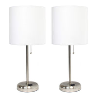 Simple Designs Lt2024-Wht Brushed Steel Stick Table Desk Lamp With Charging Outlet And Drum Fabric Shade, White Shade
