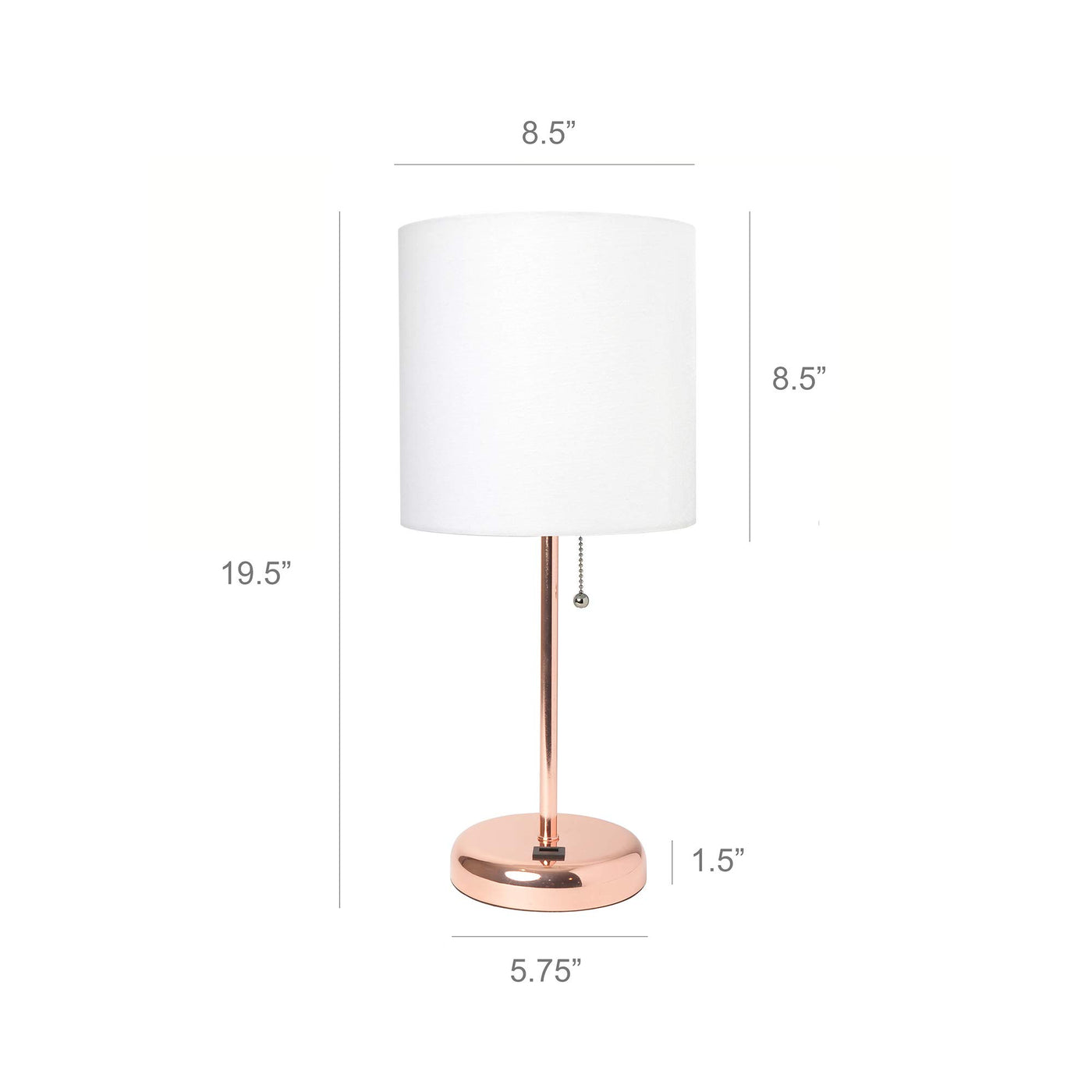CLEAN MODERN LOOK: A solid colored drum fabric shade accompanies a rose gold base giving you a slim silhouette and contemporary style lamp for your lighting needs. | USB CHARGING PORT FEATURE: You won't need to find that wall outlet behind your furniture anymore! This table lamp is equipped with a USB charging port on the base for charging your cellphone, iPad, iPod, iPhone, and other electronic devices. | ADAPTABILITY: This table lamp set with charging capabilities are ideal for just about any space whether in a bedroom, kid's room, nursery, office, or college dorm! Base measures a diameter of 5.25". | SIZING: This table lamp measures in at L: 8.5" x W: 8.5"x H: 19.5" while its shade measures Dia 8.5": x H: 8.5". The included plug in cord measures 5'. | BULB REQUIREMENT: Each lamp uses 1 x 60W equivalent Type A medium base bulb, which is not included in your purchase. | ADDITIONAL OPTIONS AVAILABLE: This lamp is sold in a variety of base and shade combinations. If this base/shade combination doesn't perfectly match your space, make sure to check out other options.
