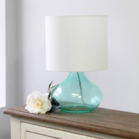 Q: What material is the lampshade made of?A: The lampshade is made of white fabric, providing a soft and warm light that complements the aqua glass base beautifully.