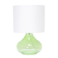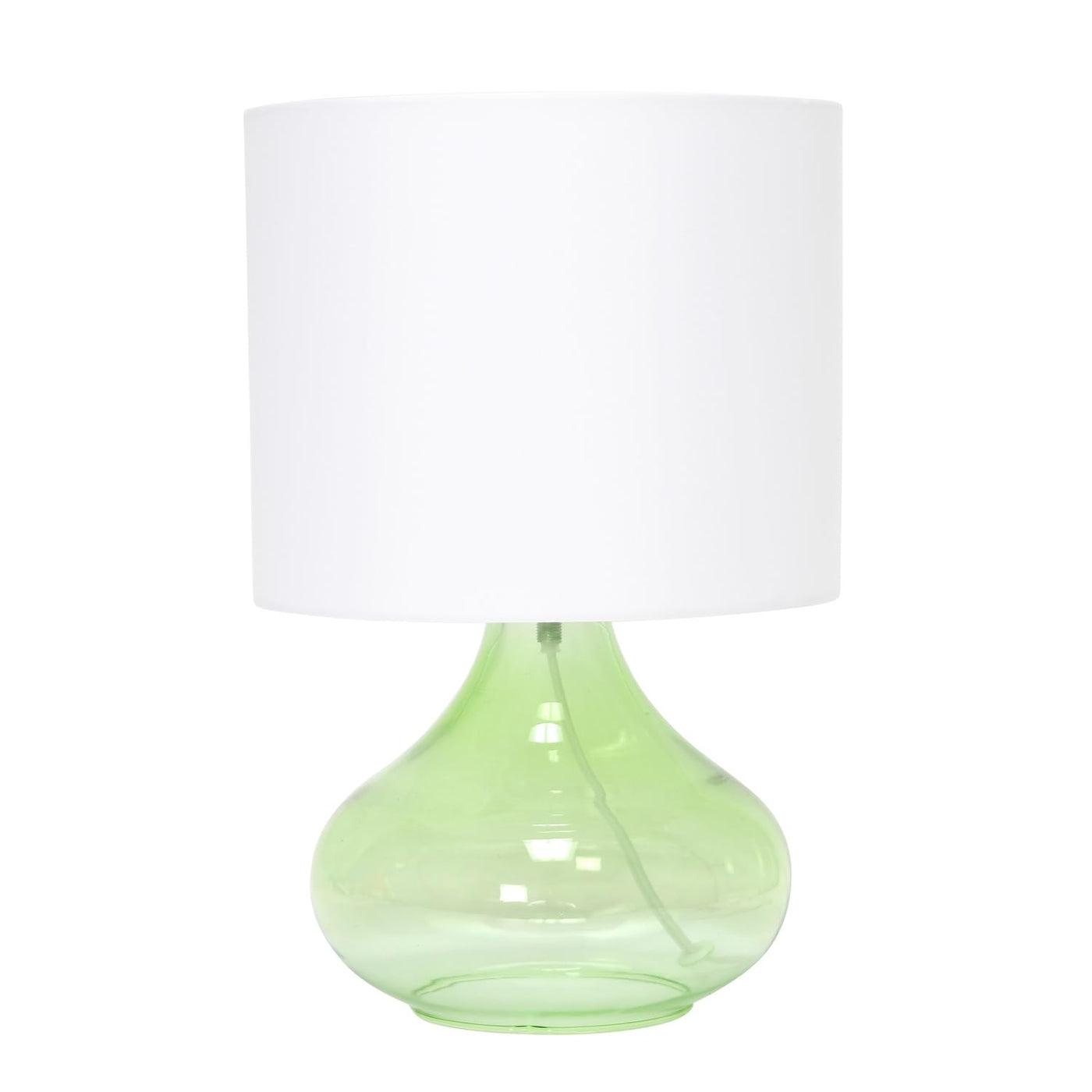 Green glass base *Open bottom base* | White fabric drum shade | Easily accessible on/off switch located on the cord | Uses 1 x 40W equivalent medium type A base bulb (not included) | Available in additional base and/or shade color options