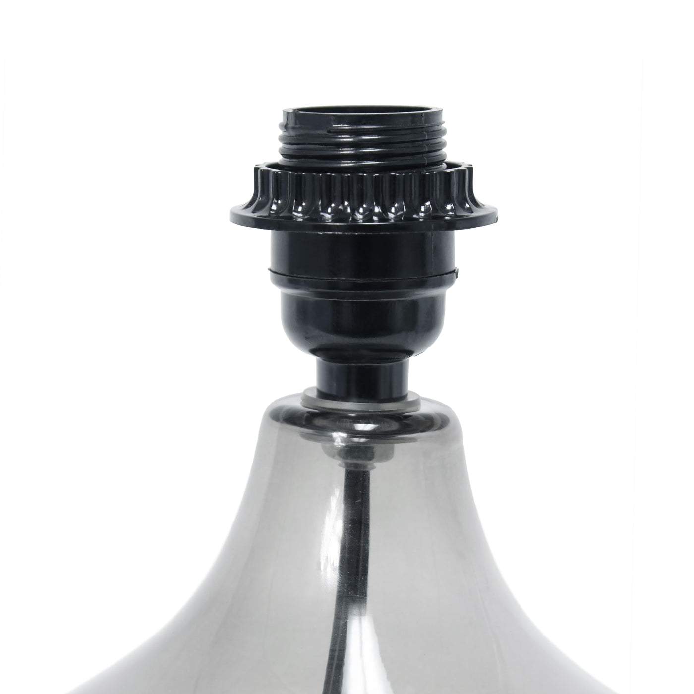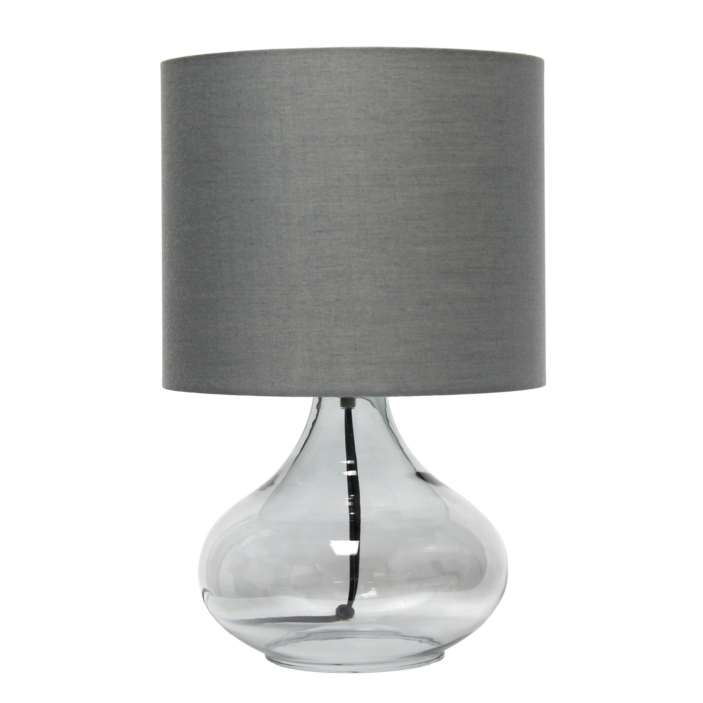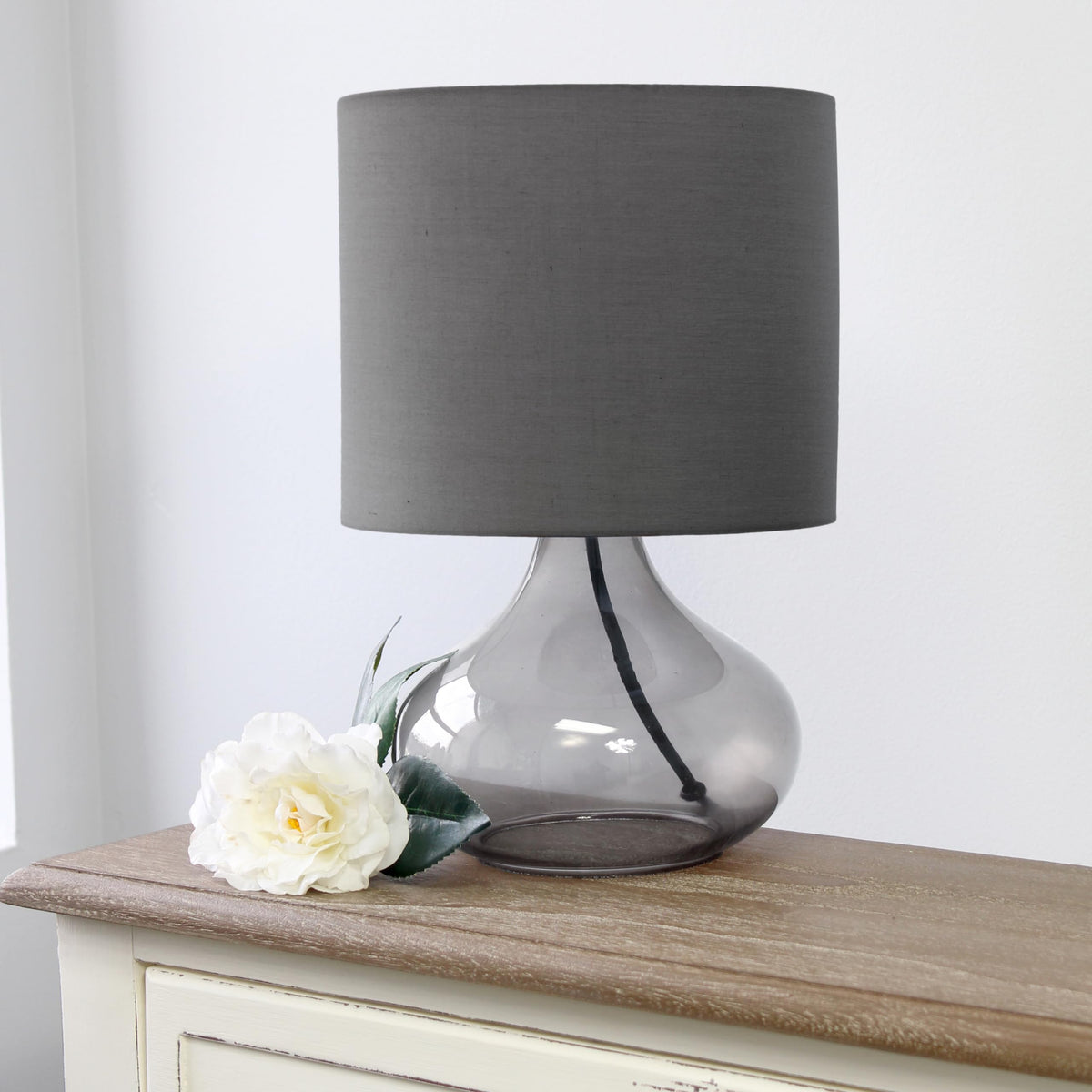 Smoke Gray glass base *Open bottom base* | Gray fabric drum shade | Easily accessible rotary switch located on the cord | Uses 1 x 40W medium type A base bulb (not included) | Available in additional base and/or shade color options