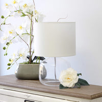 - **Stylish Design**: Each lamp showcases a sleek clear glass base and a classic white fabric drum shade, providing a versatile look that complements various interior styles.