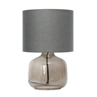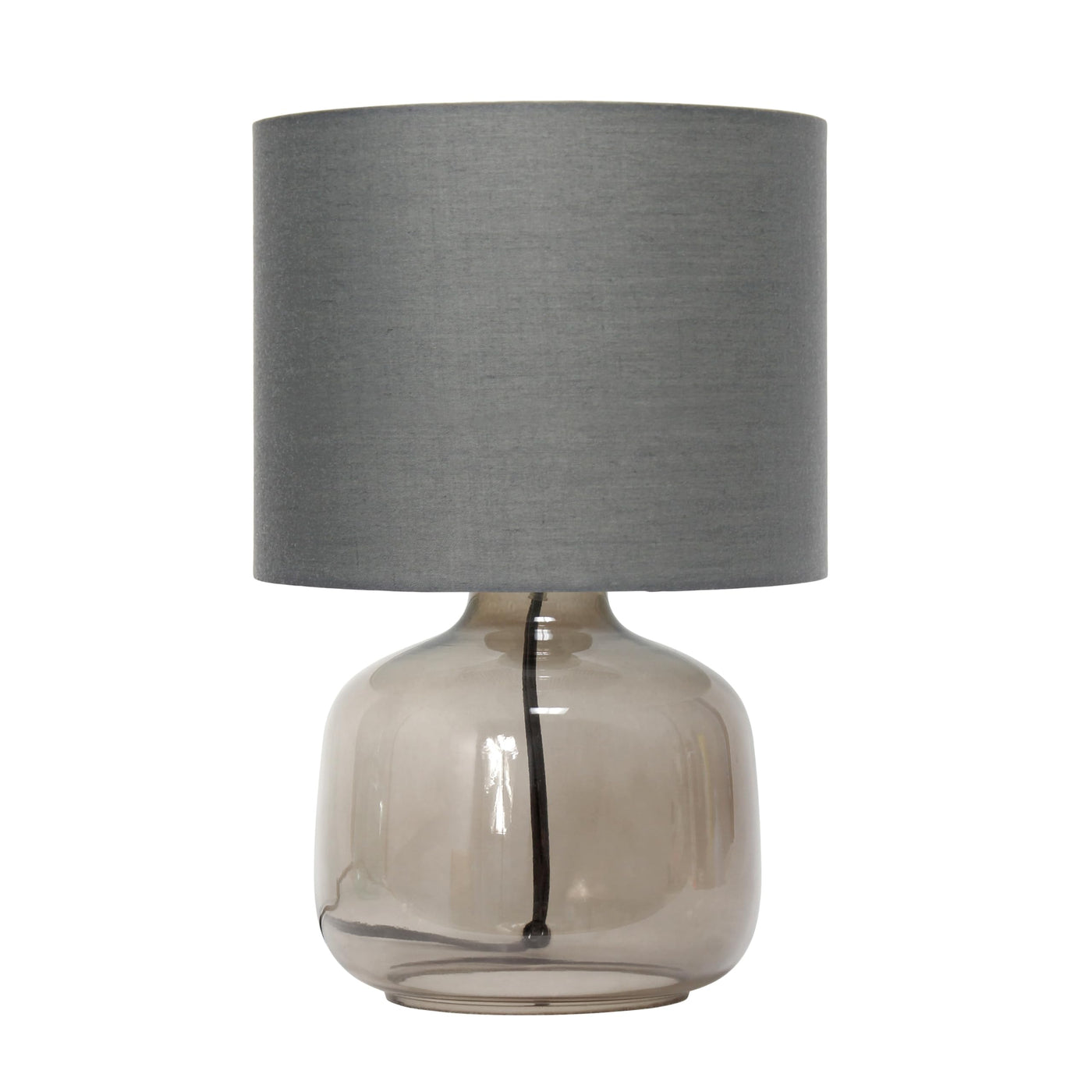 Smoke Gray glass base *Open bottom base* | Gray fabric drum shade | Easily accessible on/off switch located on the cord | Uses 1 x 40W equivalent medium type A base bulb (not included) | Available in additional base and/or shade color options | Lamp measures Dia: 9 x H: 13.75