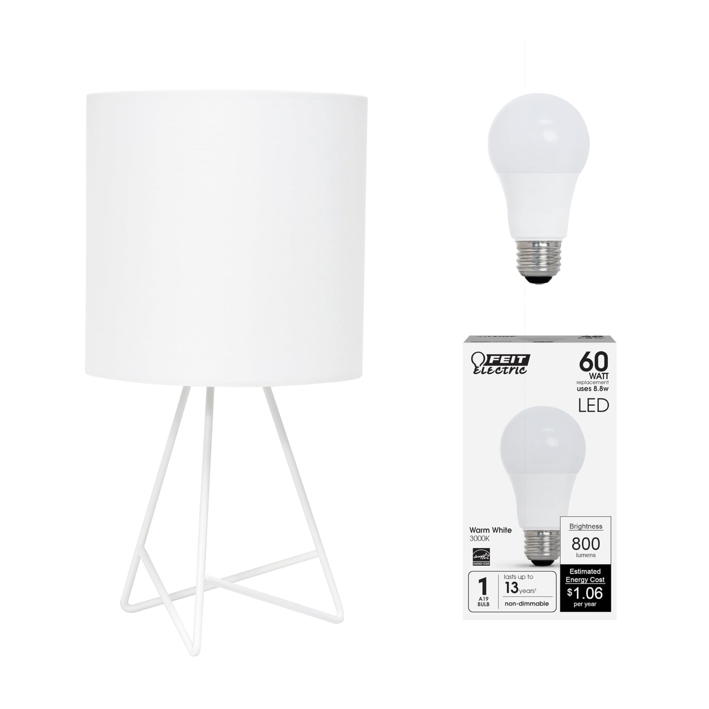 MODERN STYLE LAMP: This lamp takes a classic look and adds some modern features to make it stand out amongst your standard table lamps. A white triangular base is paired with a white fabric shade for perfection. | FEIT LED BULB INCLUDED: This table desk lamp includes 1 x 60W equivalent Type A19 Feit LED Bulb, 8.8W, Warm White 3000K, 800 Lumens | ASSEMBLY & USE: Product ships mostly assembled and will only require you to secure the lamp shade to the base using the provided socket nut prior to use. | ACCESSIBLE SWITCH: An easily accessible on/off rocker switch is located on the cord of this table lamp to allow a quick and easy on/off function as needed. Lamp is also equipped with a 5 foot black plug in cord. | ADDITIONAL OPTIONS AVAILABLE: This lamp is sold in a variety of base and shade combinations. If this base/shade combination doesn't perfectly match your space, make sure to check out other options