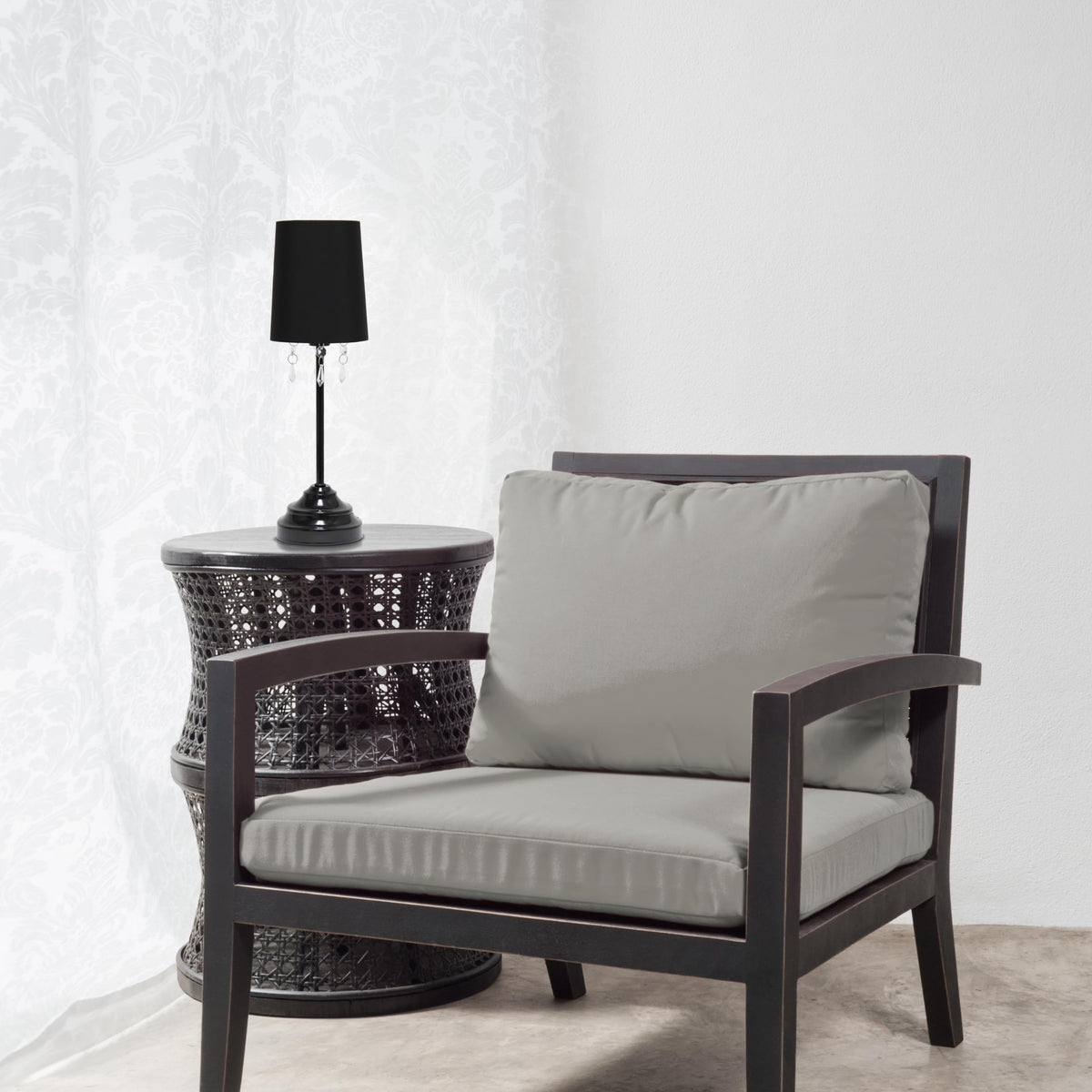 Q: What makes the Simple Designs LT3018-BLK Table Lamp unique?A: The lamp features a painted metal base adorned with hanging acrylic beads and a matching fabric shade, offering a unique and stylish design that enhances any decor.