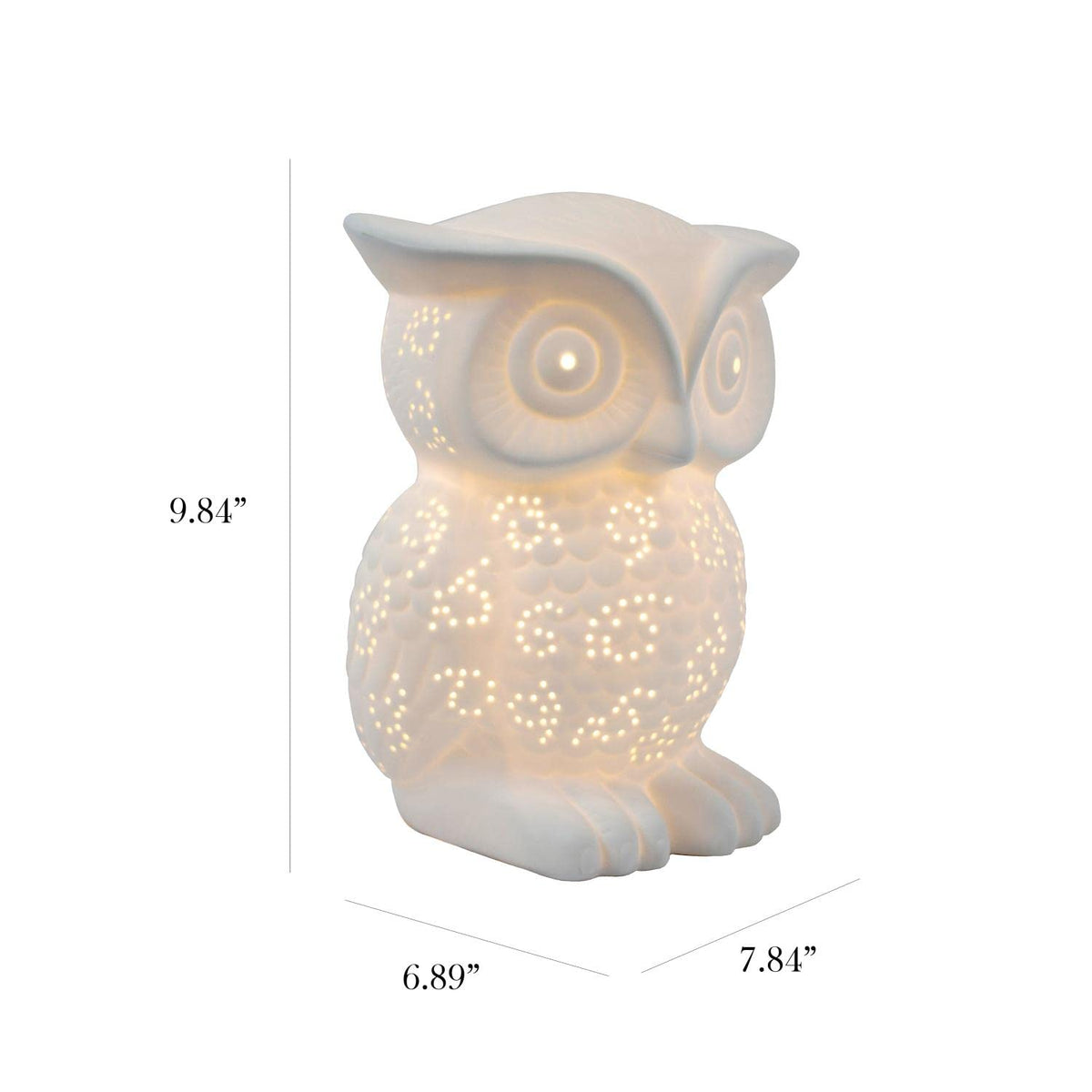 Q: What are the dimensions of the Owl Table Lamp?A: The dimensions of the Simple Designs LT3027-WHT Owl Table Lamp are approximately 6.89 inches in length, 7.48 inches in width, and 9.84 inches in height.