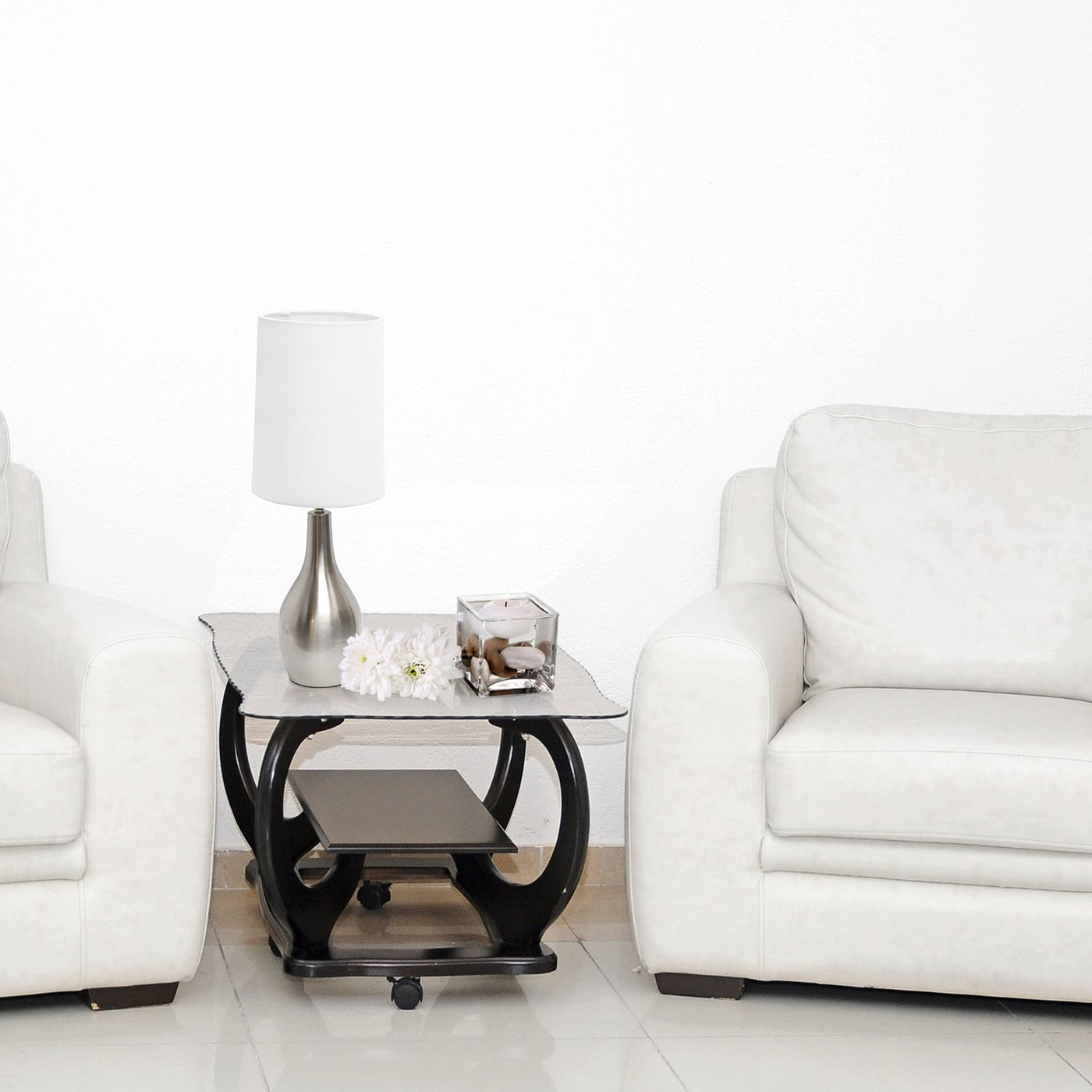 Flawless Brushed Nickel Finish Base | White Fabric Shade | Sleek and simple, adaptable to all room types | Uses 1 x 40W equivalent E26 Medium Base Type A Bulb (not included) | Shade Dimensions: Bottom Opening: 7" Top Opening: 6.25" Height: 9.25" | No Assembly required