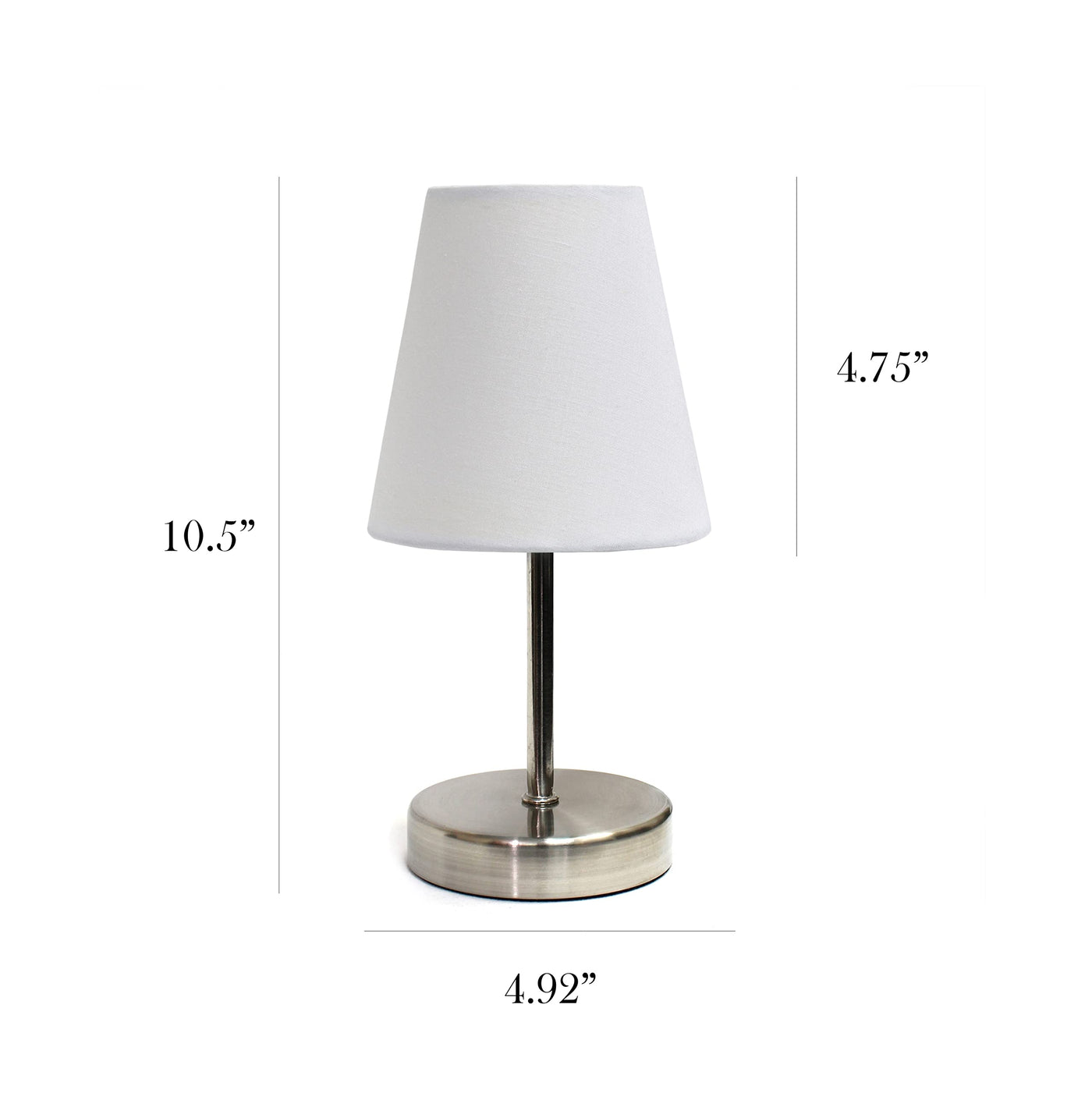 Q: What are the dimensions of the Simple Designs LT2013-WHT-2PK table lamps?A: Each lamp measures 10.5 inches in height with a shade diameter of 4.92 inches, making them compact and suitable for various settings.