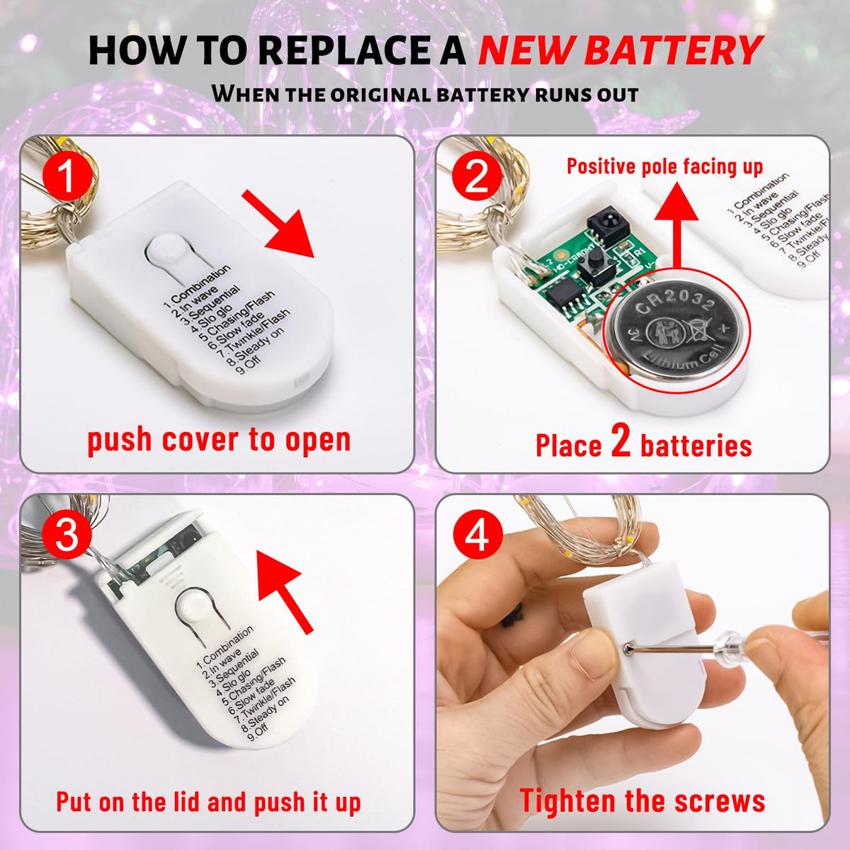 Q: How long do the batteries last in the fairy lights?A: The lights can operate for up to 5 days on a full set of batteries. The package includes 2 CR2032 batteries for immediate use and an additional 6 batteries for replacement.